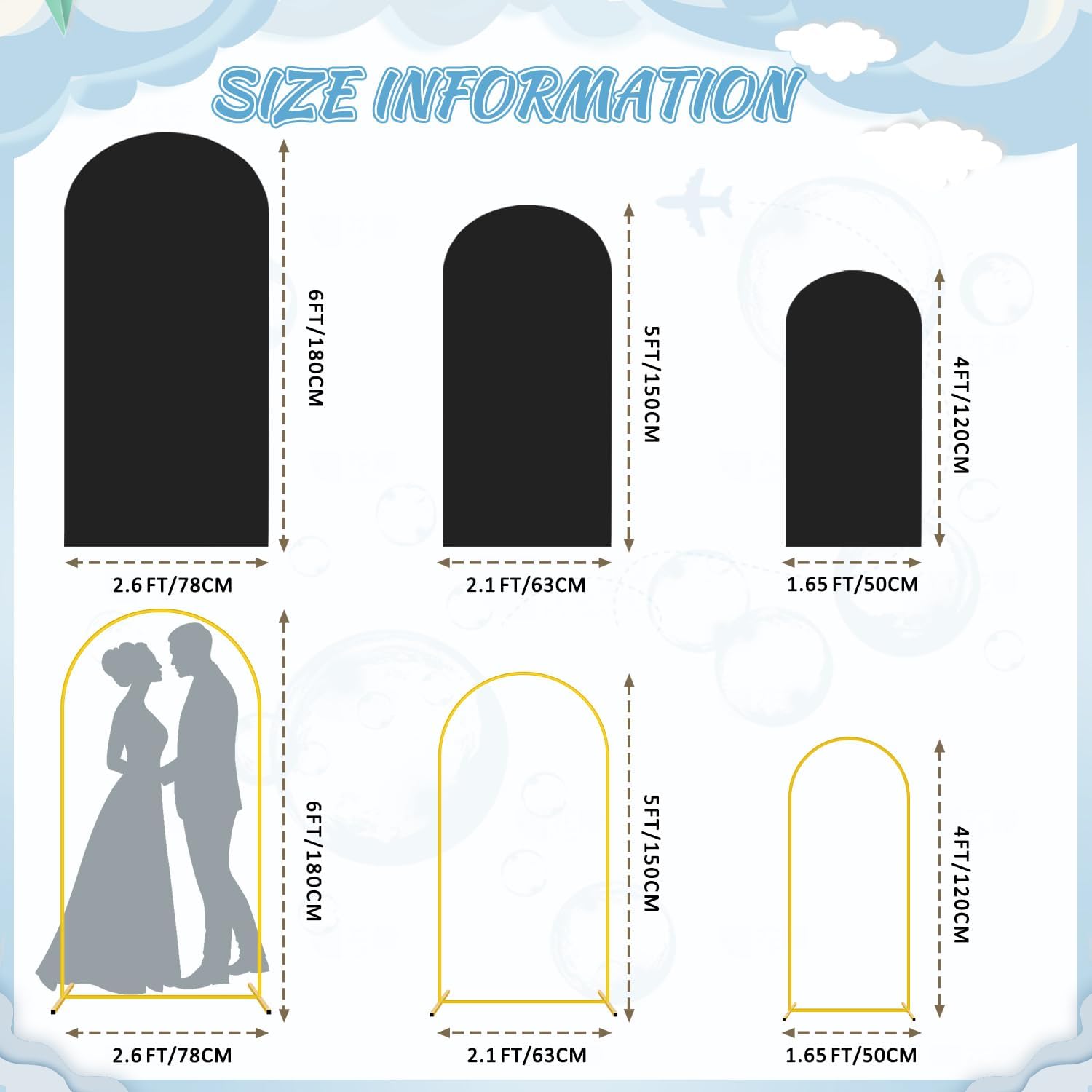 • 🧸【Size Information- Arch Backdrop Stand and Cover Set】Arch stand and cover set includes 3 gold metal arch backdrop stands and 3 black arch cover in sizes 6FT x 2.6FT(H x W), 5FT x 2.1FT(H x W) and 4FT x 1.65FT(H x W). The backdrop arch stand with cover is certain to meet your decoration needs and add a charming look to your celebrations.