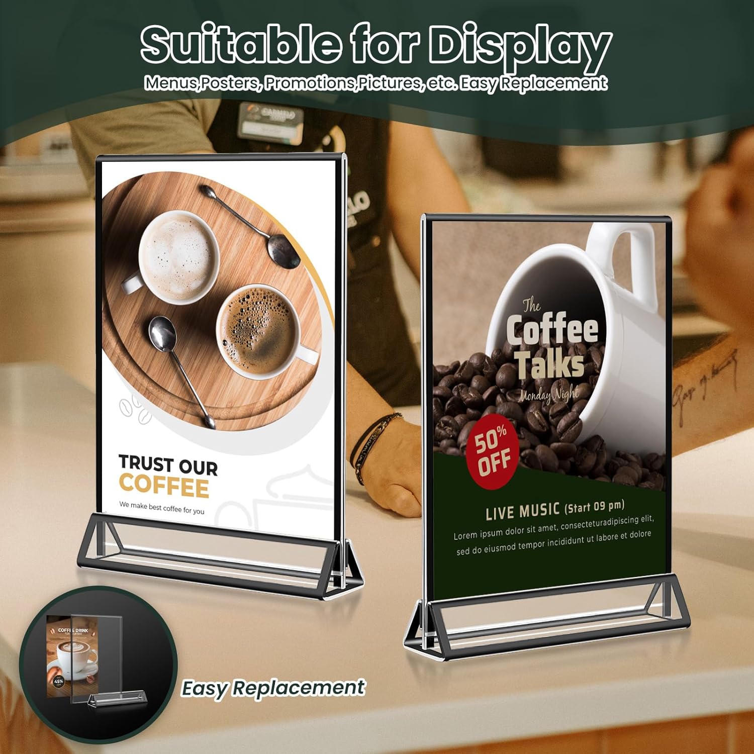 • 【Double-Sided Display Design】This uniquely designed 15 Pack 4x6 black acrylic sign holder features a back-to-back double-sided display design. Its vertical double-sided structure ensures clear visibility of two photos or menu signs, making your table arrangement practical and visually appealing from any angle.