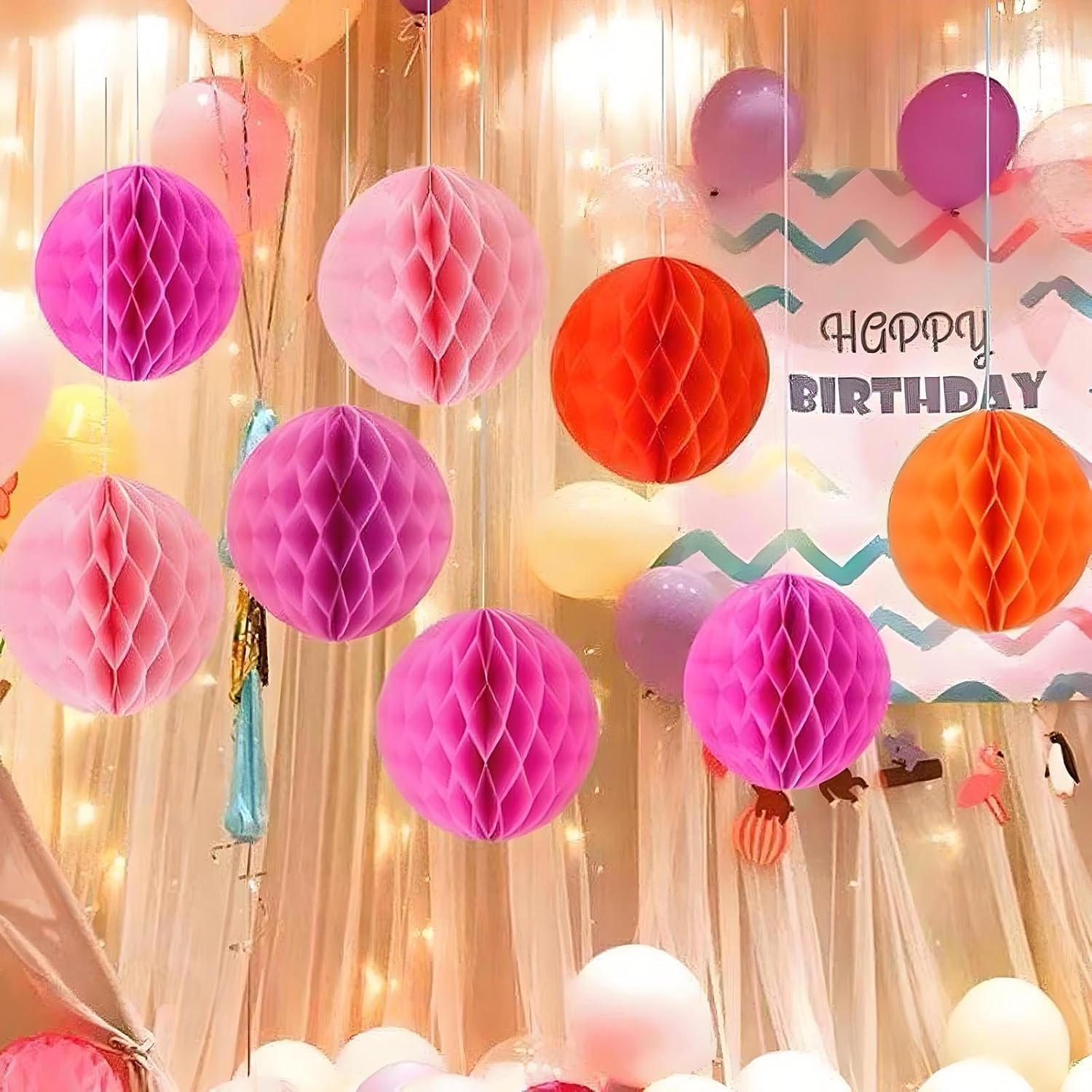 • 【Tri-Color Bloom Design】​Vibrant Rose red light pink orange honeycomb balls create a soft, feminine gradient for weddings, baby showers, or birthday parties. Perfect for photo backdrops, garland arches, or table centerpieces.