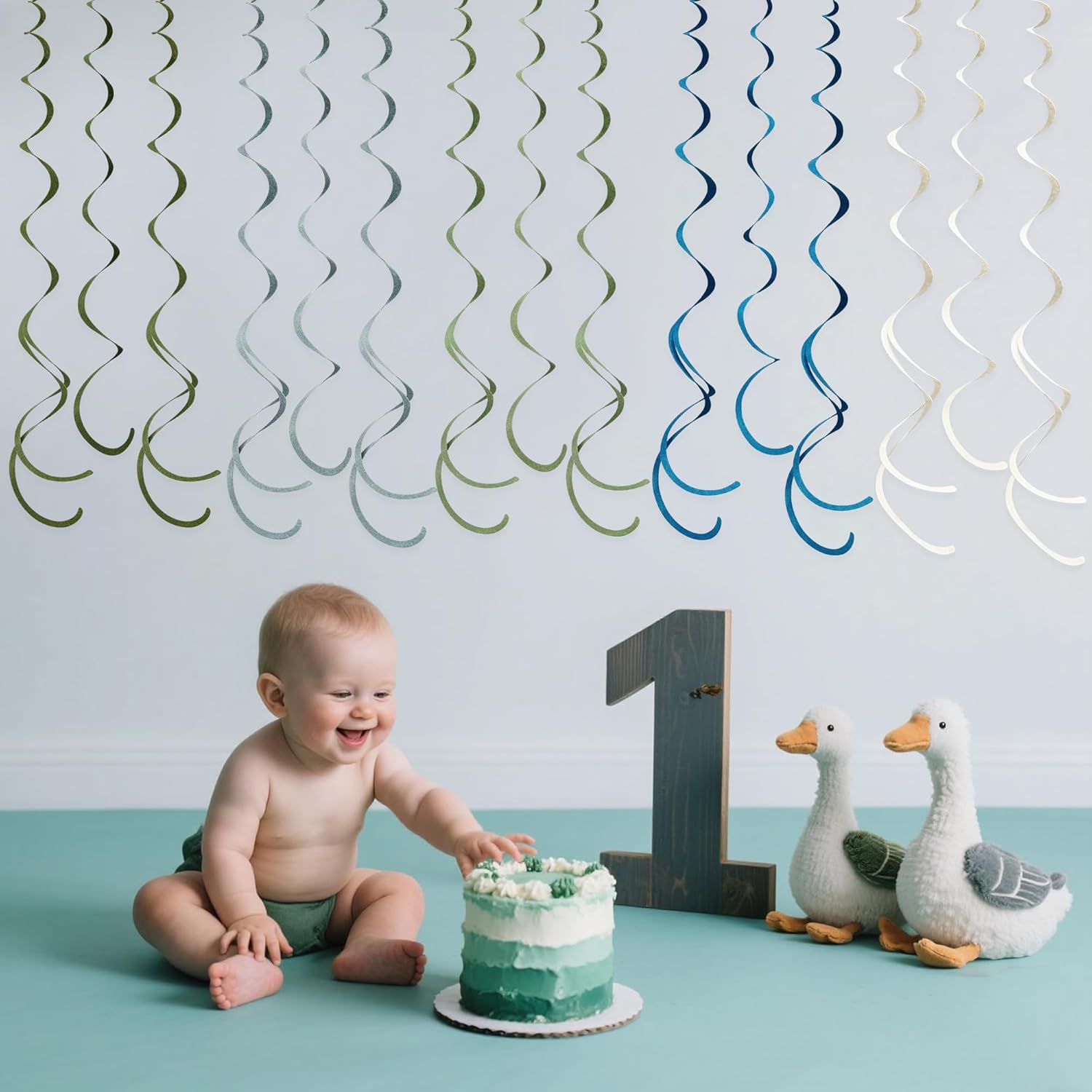36 Pcs Sage Green Dusty Blue Hanging Swirl Decorations Blue Sage Green Felt Swirl Streamer Spiral Ceiling Garland for Baby Shower Birthday Retirement Wedding Safari Silly Goose Theme Party Supplies