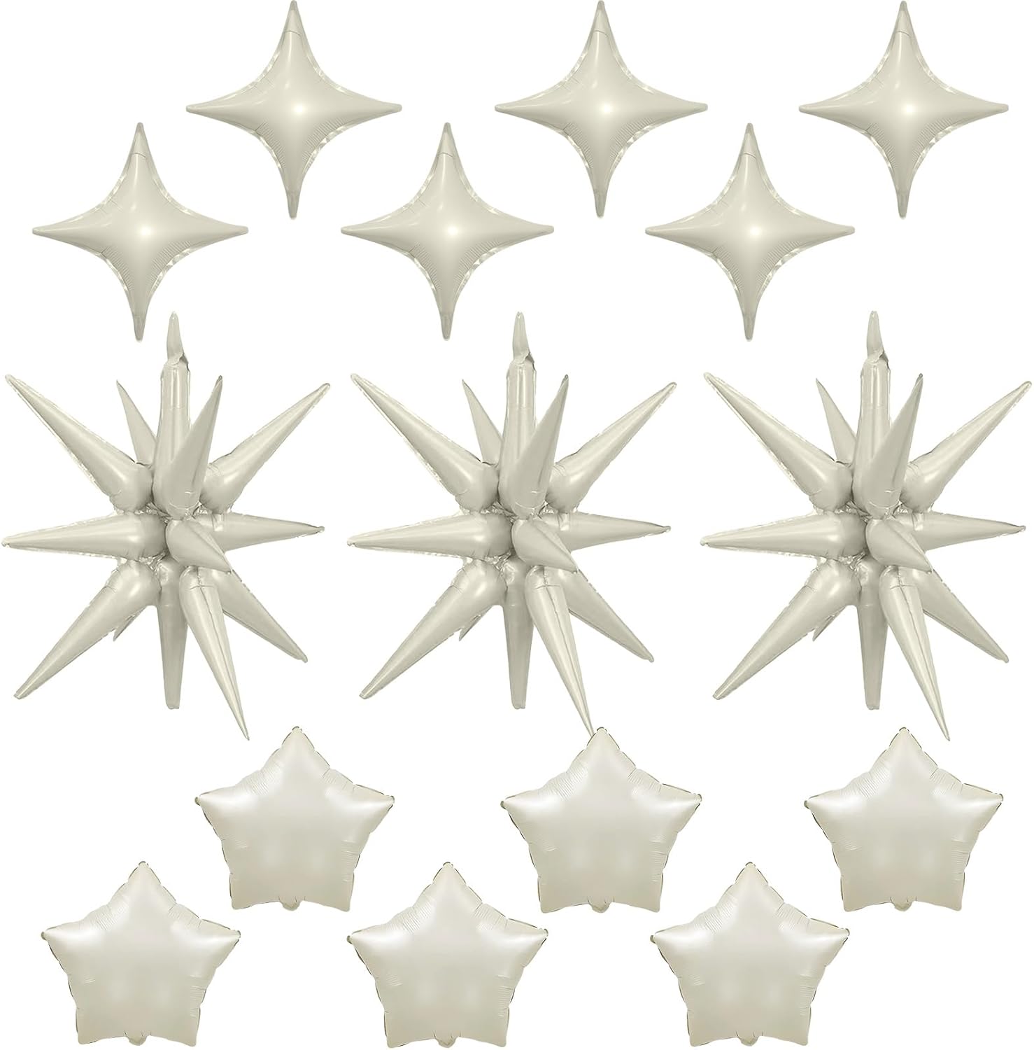 • White Sand Star Balloons: Package includes: cream aluminum foil star balloons (explosion spike × 3, four-pointed stars × 6, five-pointed stars × 6) , a straw and ribbon