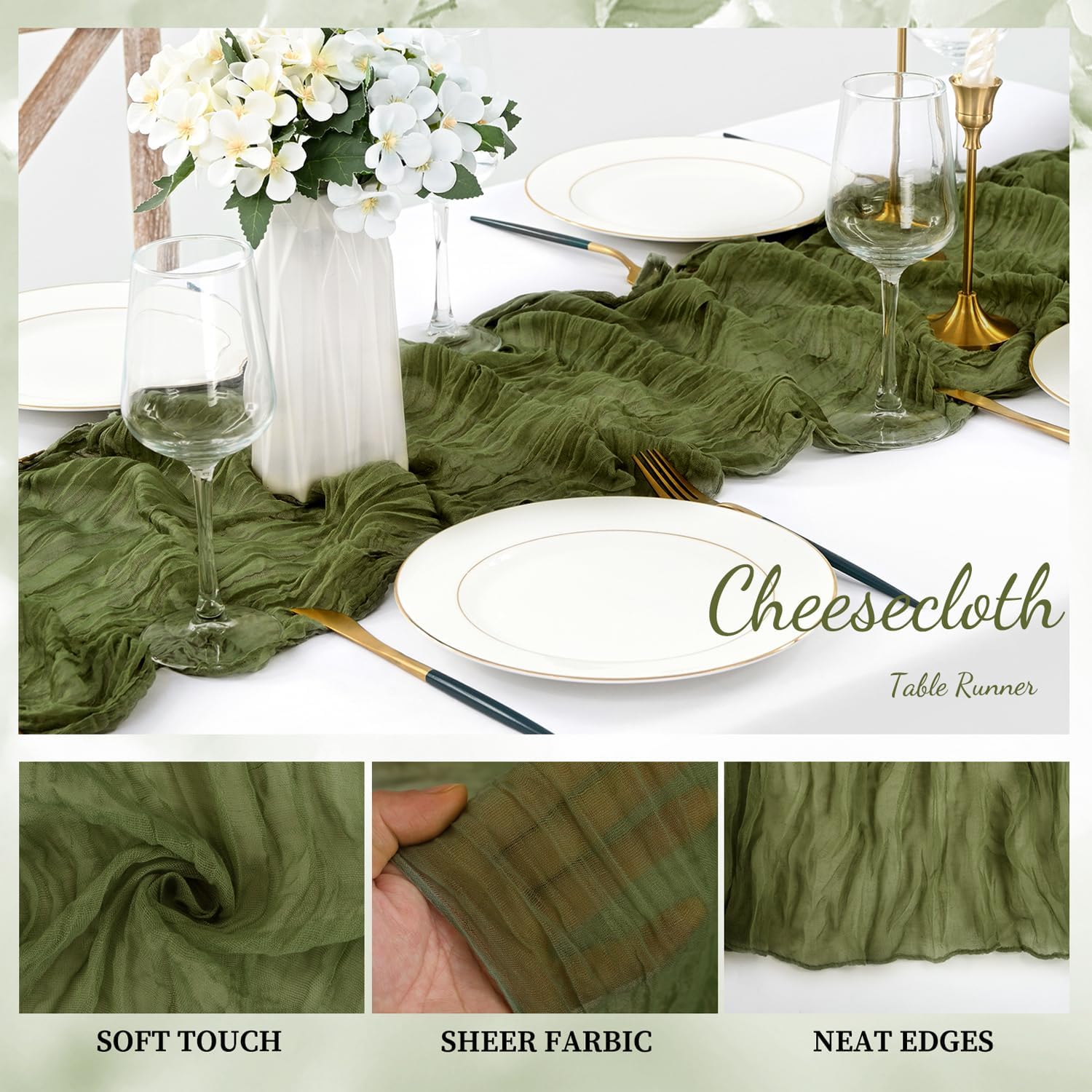 6 Pack Olive Green 10FT Cheesecloth Table Runner Rustic Gauze Cheese Cloth Table Runner for Wedding Bridal Baby Shower Table Decorations Boho Fabric Sheer Birthday Party Decor 20 x 120 Inch Long