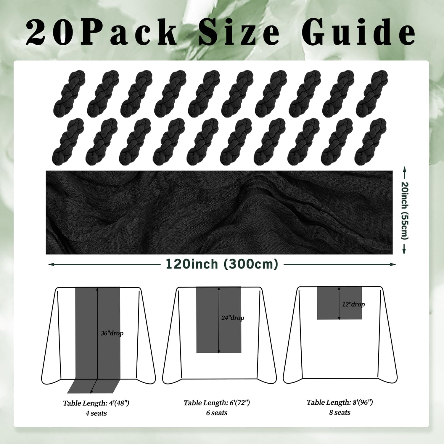 • Cheesecloth Table Runner Size: You will receive 20 black cheesecloth tablerunner, each measuring 20 x 120 inches. The quantity is sufficient for you to decorate various romantic occasions. It can decorate most shaped tables, such as rectangular tables, round tables, and cocktail tables. It is long enough to decorate a large table and be placed perfectly and elegantly on the tabletop, adding a romantic atmosphere to your occasion.