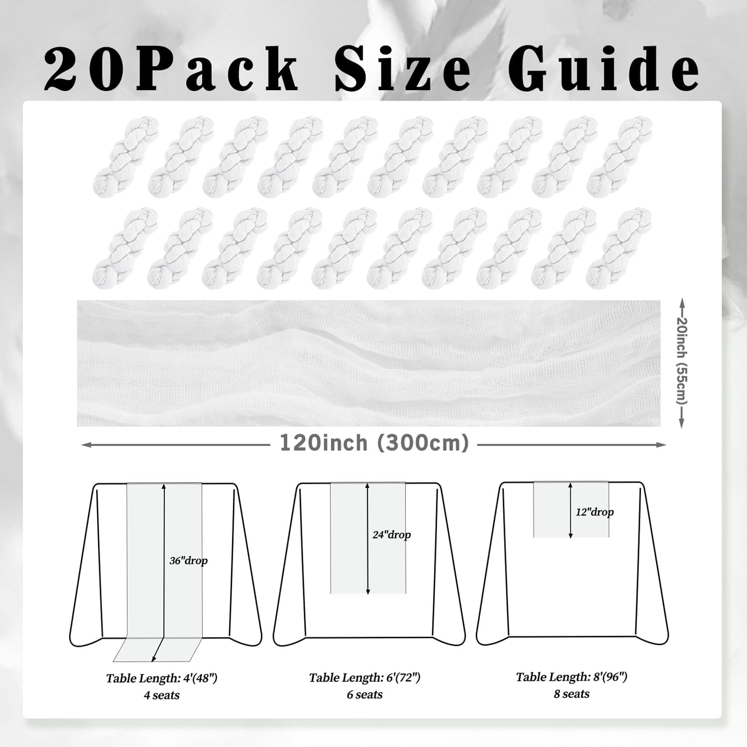 • Cheesecloth Table Runner Size: You will receive 20 white cheesecloth tablerunner, each measuring 20 x 120 inches. The quantity is sufficient for you to decorate various romantic occasions. It can decorate most shaped tables, such as rectangular tables, round tables, and cocktail tables. It is long enough to decorate a large table and be placed perfectly and elegantly on the tabletop, adding a romantic atmosphere to your occasion.