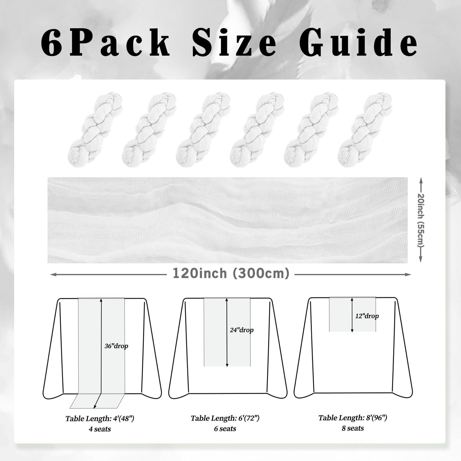 • Cheesecloth Table Runner Size: You will receive 6 white cheesecloth tablerunner, each measuring 20 x 120 inches. The quantity is sufficient for you to decorate various romantic occasions. It can decorate most shaped tables, such as rectangular tables, round tables, and cocktail tables. It is long enough to decorate a large table and be placed perfectly and elegantly on the tabletop, adding a romantic atmosphere to your occasion.