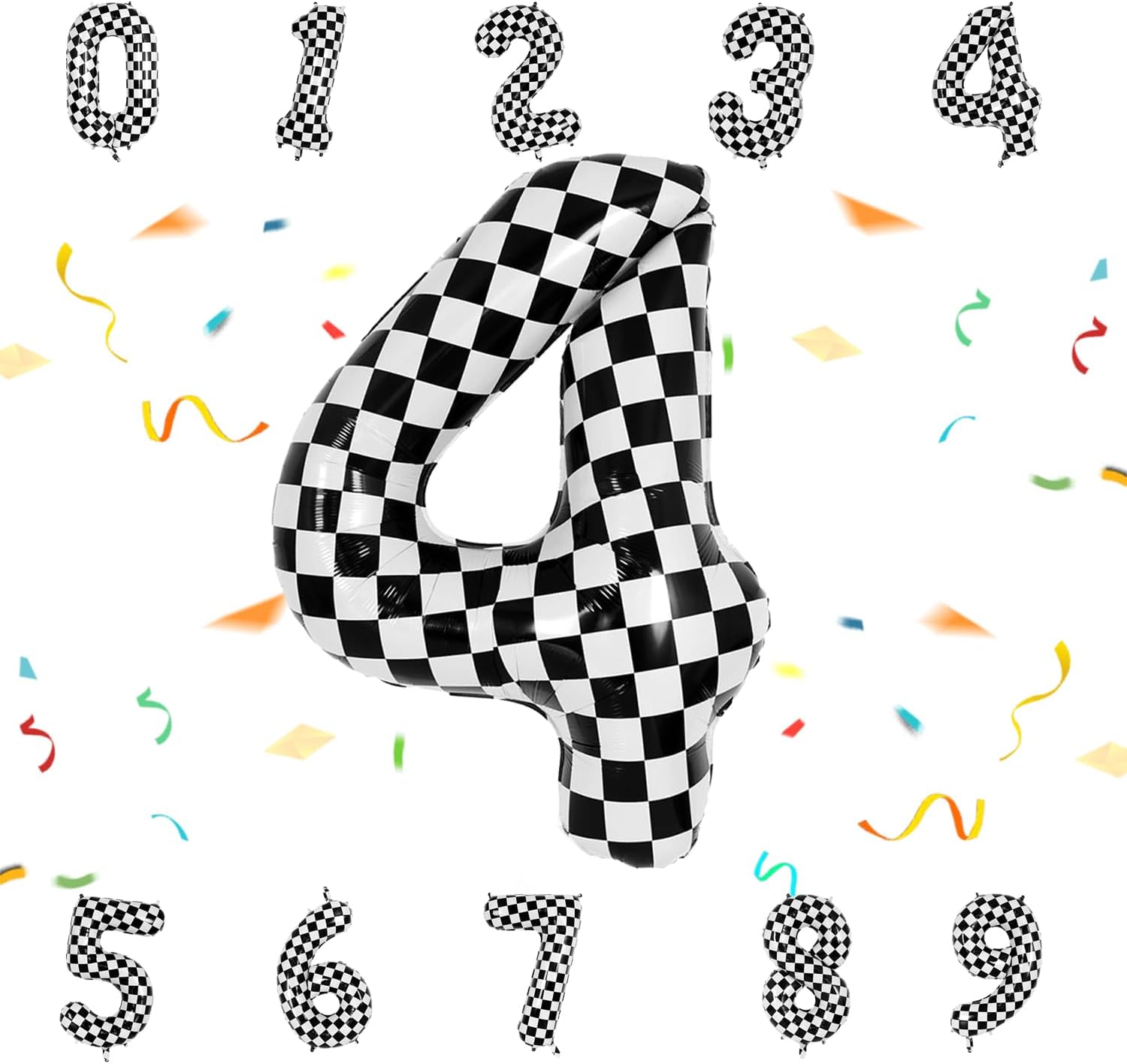 40 Inch Checkered Number Balloon - Race Flag Pattern Big Helium Balloon for Birthday Party Decorations - Black & White Balloon for Kids Adults Party Supplies (Racing Car, Number 4)