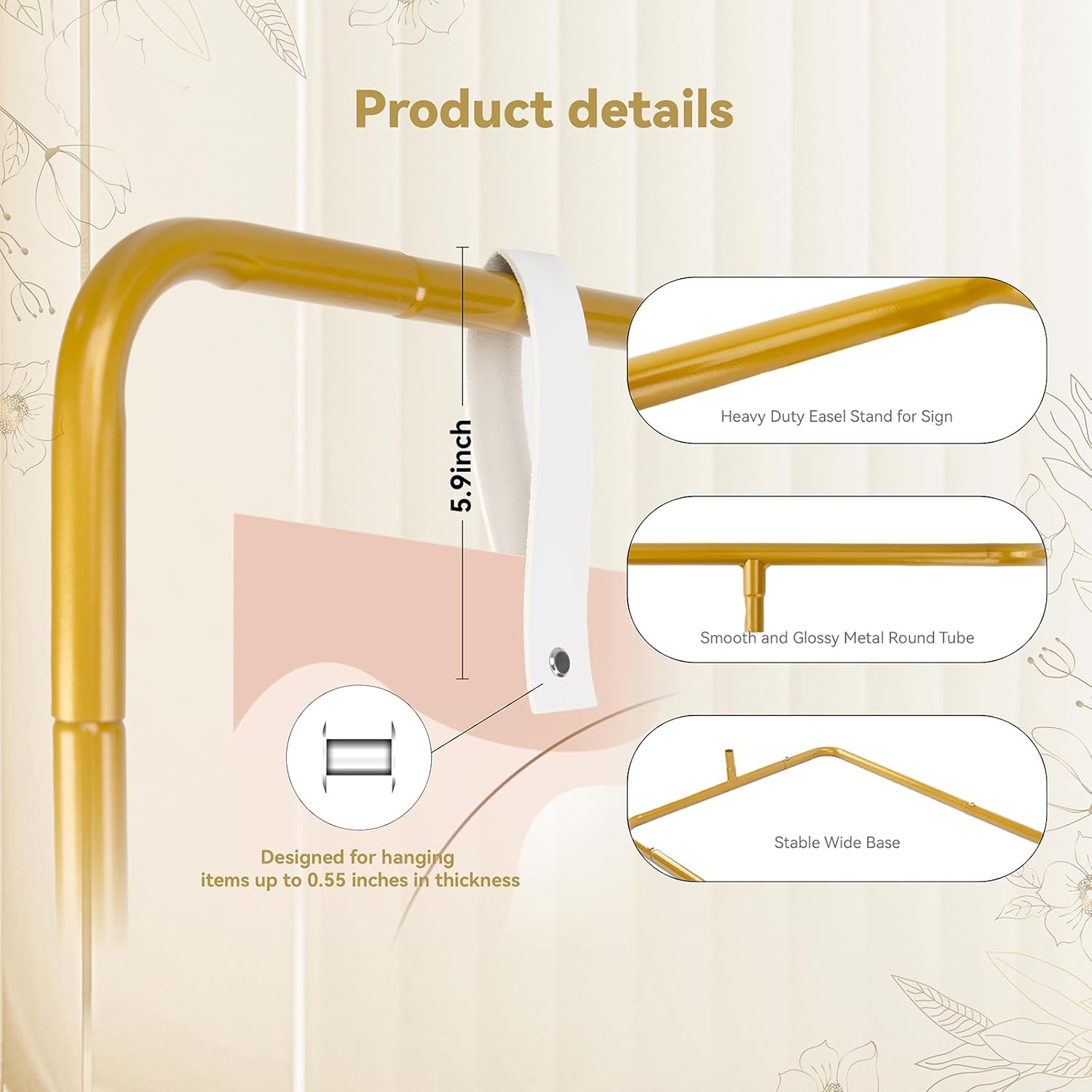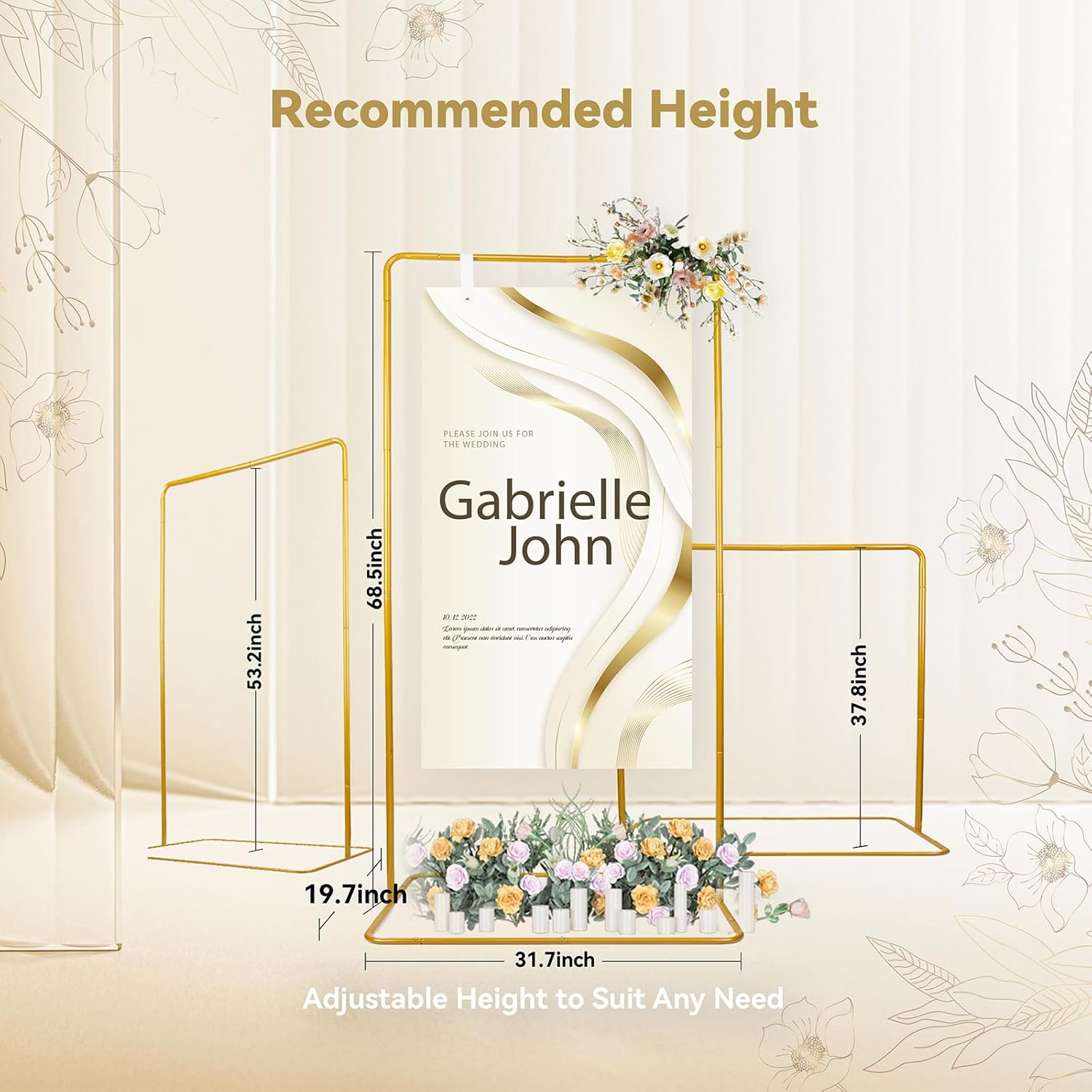 • Adjustable Height: 3 recommended available height (68.5"/53.2"/37.8"). The metal easel stand for sign features a 31.7" wide base, designed to stably support a large sign, poster, seating chart and similar displays & while maintaining refined visual elegance