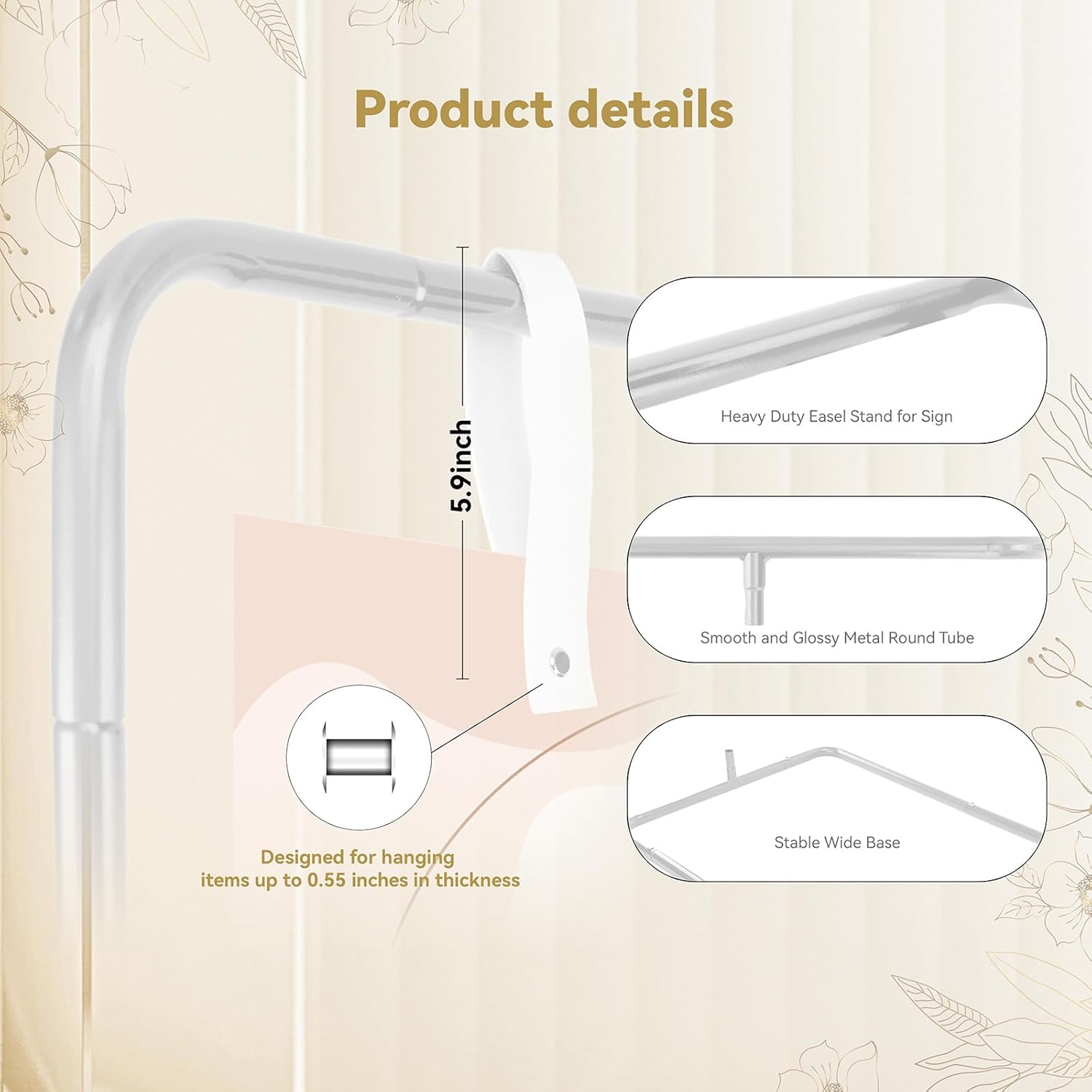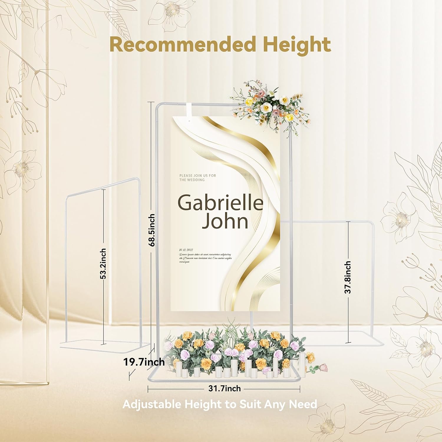 • Adjustable Height: 3 recommended available height (68.5"/53.2"/37.8"). The metal easel stand for sign features a 31.7" wide base, designed to stably support a large sign, poster, seating chart and similar displays & while maintaining refined visual elegance