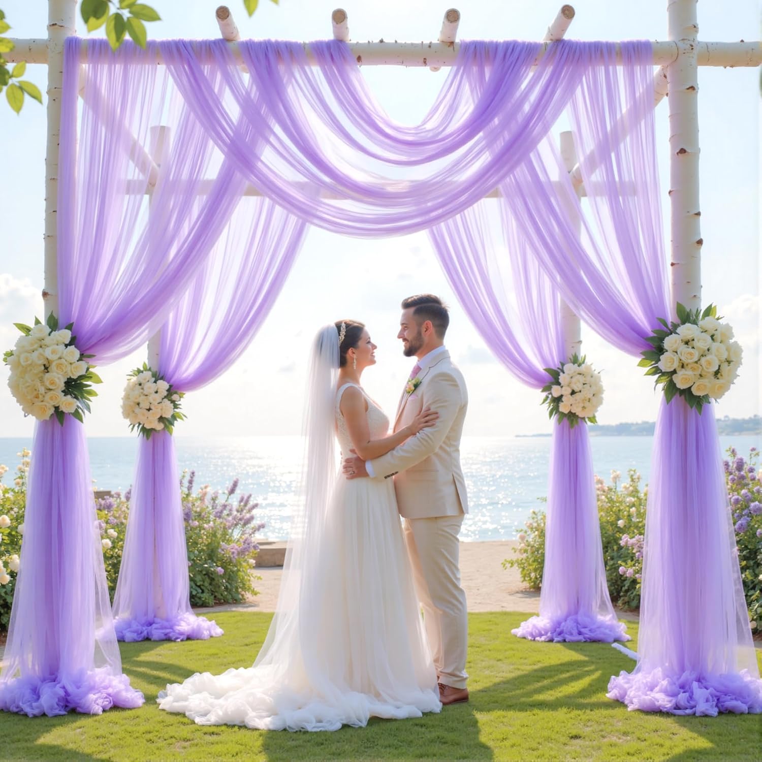 • Best Choice Wedding Arch: Package includes 2 panels purple wedding arch sheer drapes, each panel is 60 inches wide and 26 ft long. The drape of the fabric is perfect for use in a wedding arbor. These arch fabric add a pretty touch to pillars at a wedding.