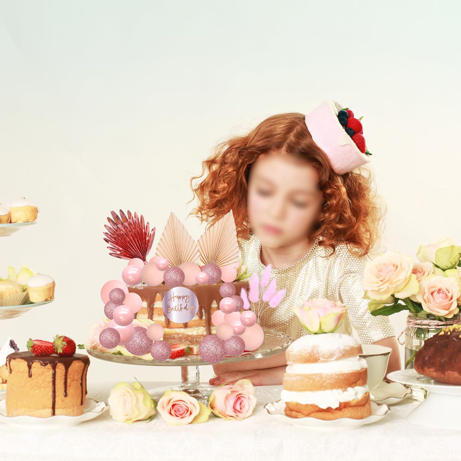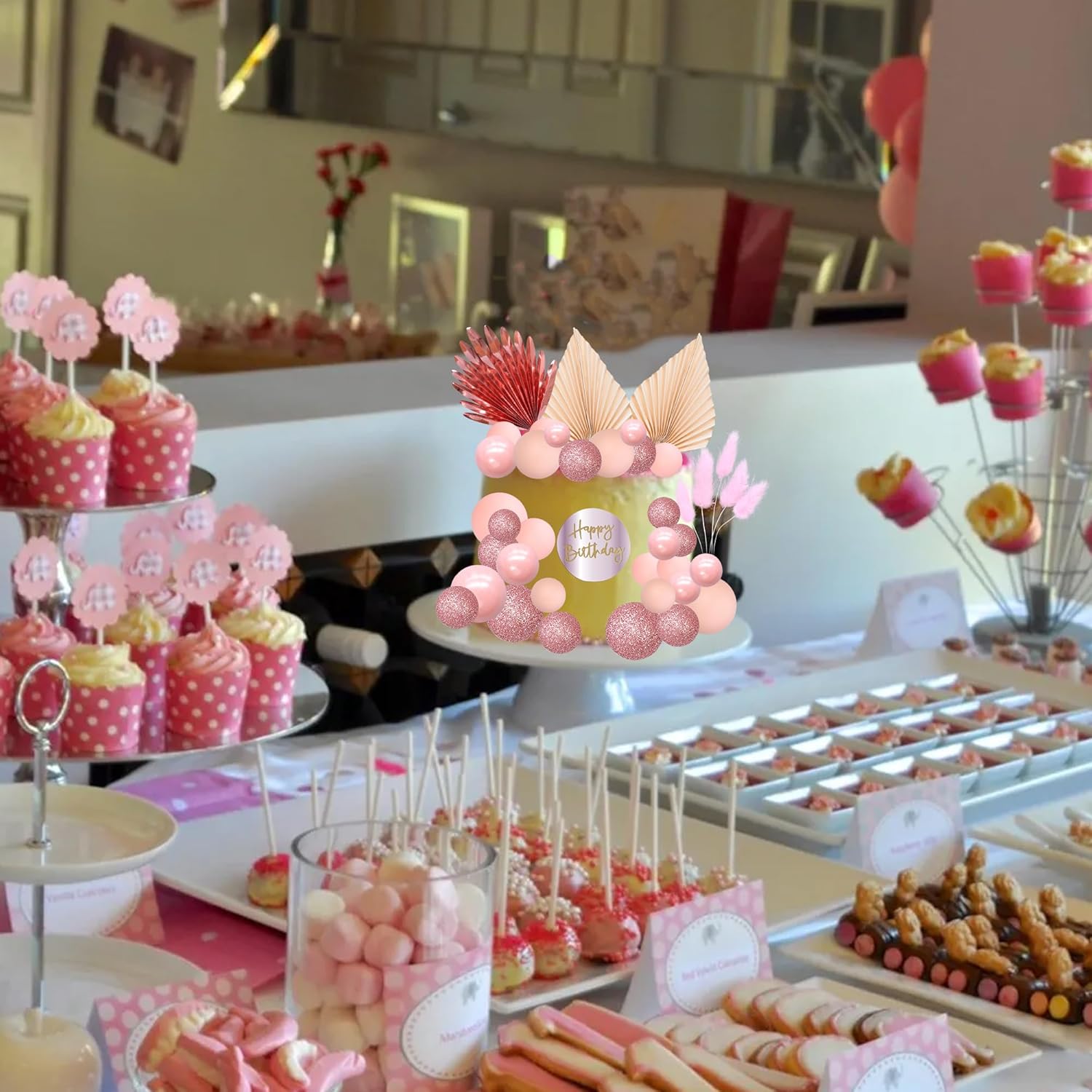 Ephlyn 33 Pack Balls Cake Toppers Boho Palm Leaves Cake Decorations Round Acrylic Happy Birthday Cupcake Toppers for Birthday Wedding Baby Shower Party Supplies Rose Gold