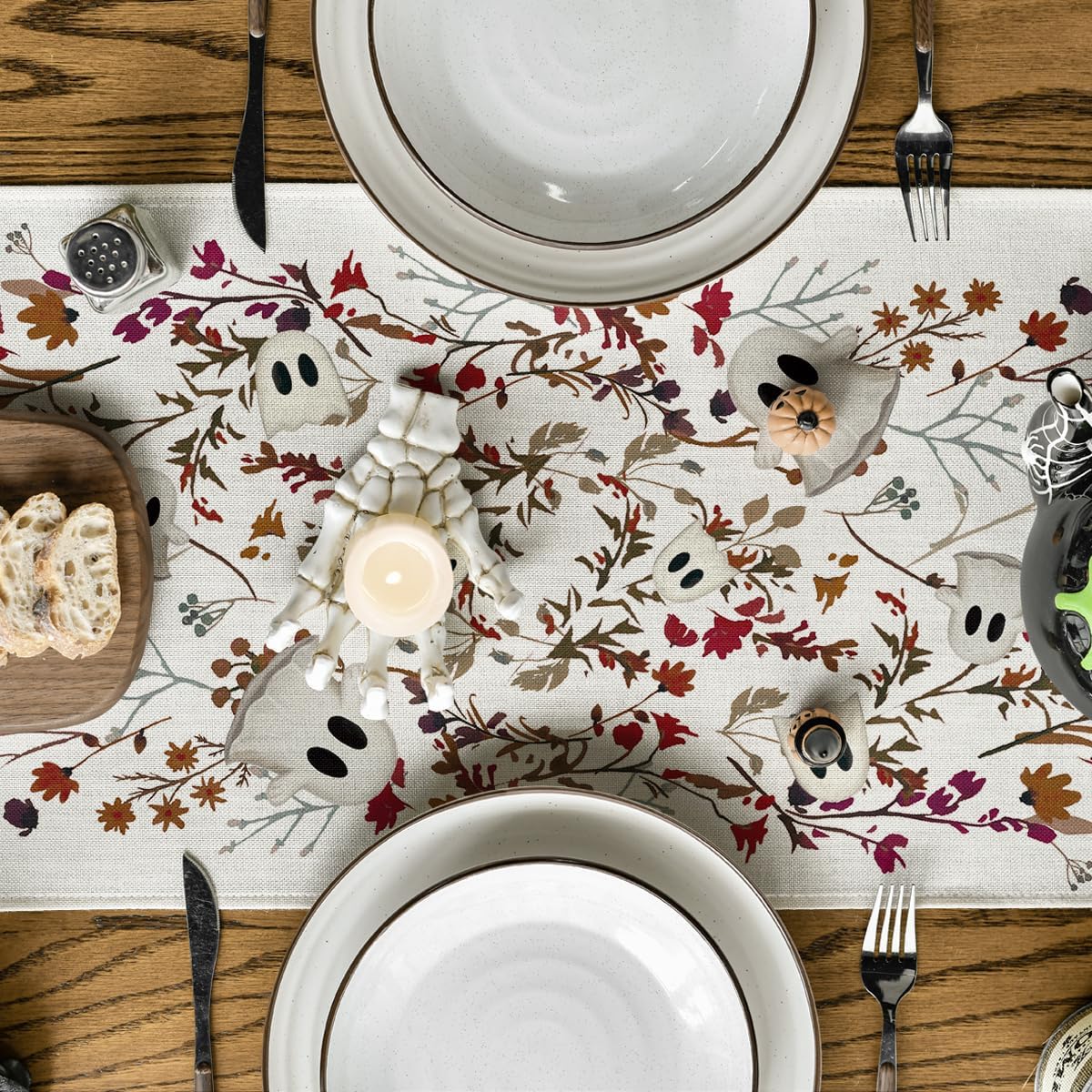 Artoid Mode Ghost Flowers Leaves 210 GSM Halloween Table Runner,Seasonal Fall Kitchen Dining Table Decoration for Home Party Decor 13x48 Inch