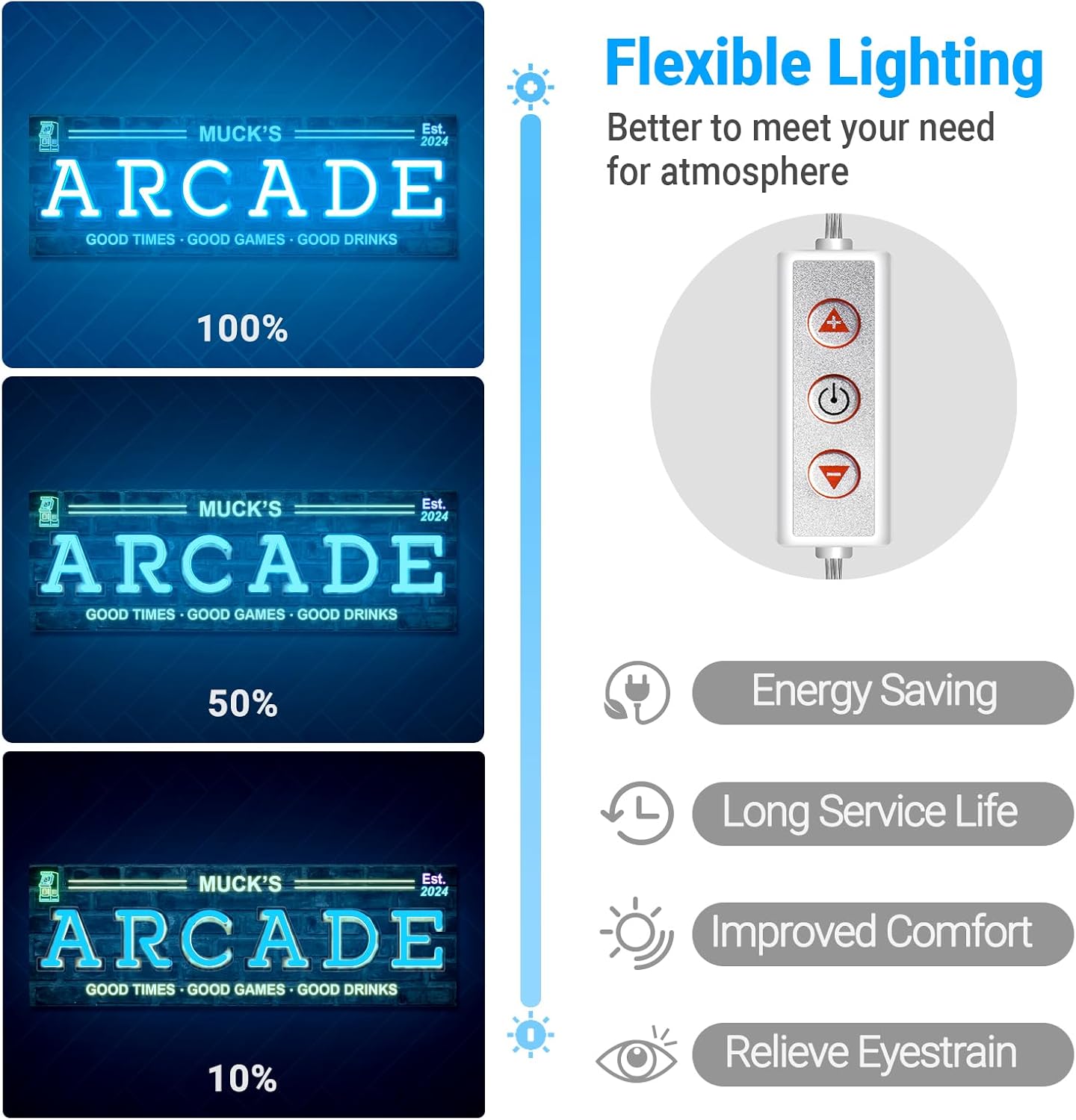• 🌟【3D Engraving Process】Our customizable arcade neon signs feature a upgraded 3D engraving process, where custom text and graphics are etched onto a clear acrylic board. The stereo carvings are colorless and illuminated by vibrant colored LED neon strips that bring out the best 3D lighting, adding depth and brightness to turn any wall into a personalized artwork.