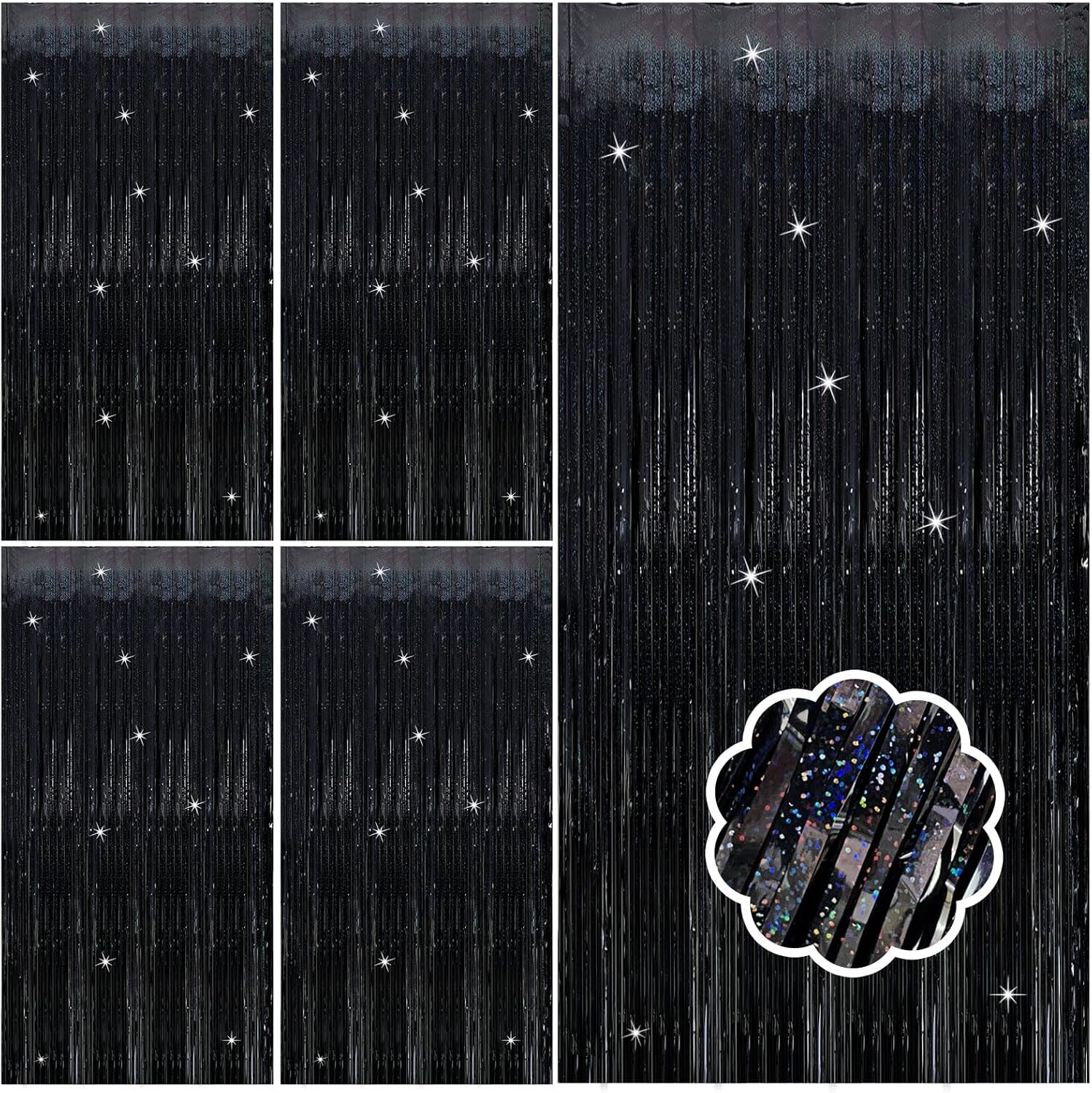 • Black Steamers Set (5-Pack): Each dazzling curtain measures 3.28ft x 6.56ft – perfect for doors, walls, or photo booths! These extra-long foil streamers instantly transform any space into a party-ready celebration zone. Mix, layer, and customize your decor for the best results.