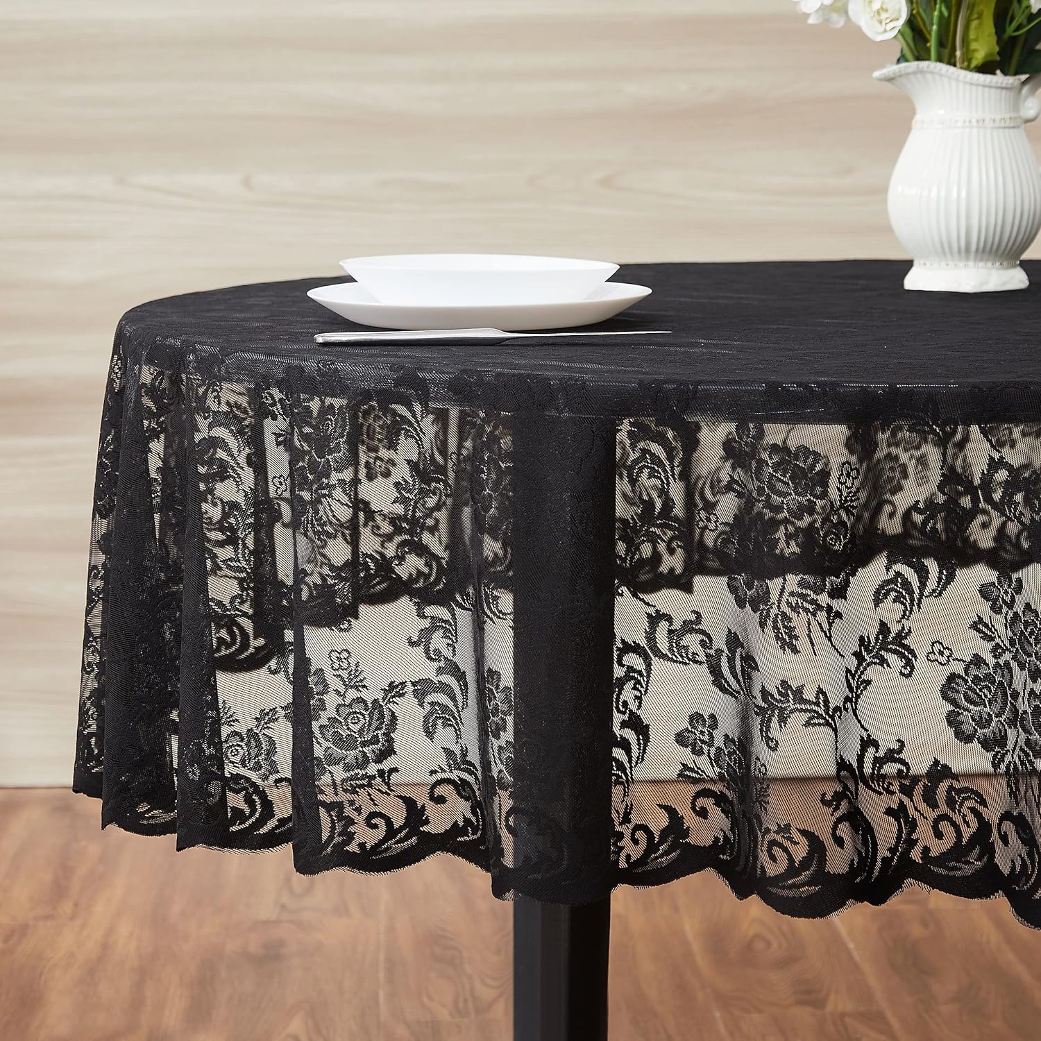 LinenZone Extra Large Black Round Tablecloth for Rustic Vintage Decor. Sheer Lace Table Cloth Works Great As Wedding Tablecloth or Thanksgiving Table Cover. (Mia 132 Round, Black)