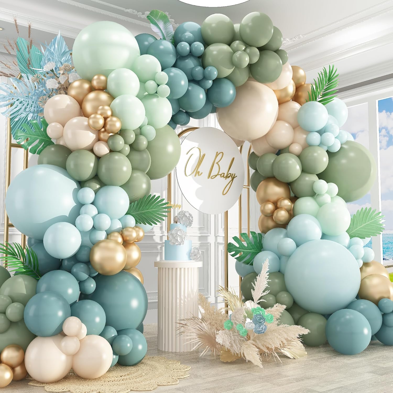 • Package List :Blue and Green Balloon Arch Kit includes 18" dusty blue/pastel green/sage green/Sand White balloons(12 pcs), 12" dusty blue/sage green/pastel blue/pastel green /sand white/metallic gold balloons(100 pcs), 10" dusty blue/sage green/pastel blue/pastel green /sand white/metallic gold balloons(100 pcs), 5" dusty blue/sage green/pastel blue/pastel green /sand white/metallic gold balloons(100pcs),glue dotsx200, ribbonx2, decorative stripx2. plenty in quantity, Perfect for creating jungle woodland theme party and sage green balloons party