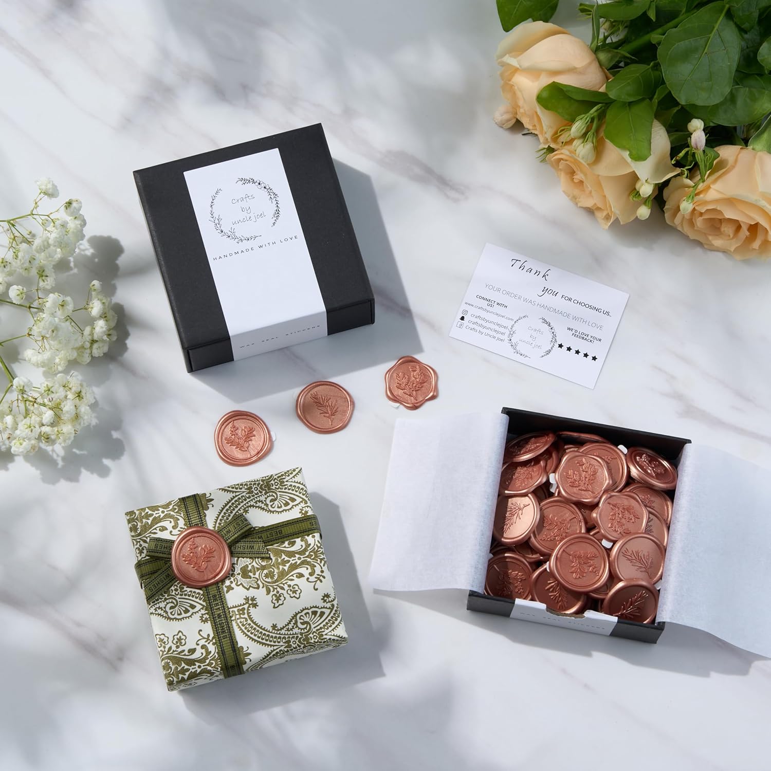 • PREMIUM DESIGNS & QUALITY: Elevate your wedding invitations with Crafts by Uncle Joel's envelope seal stickers. Each beautifully packaged set of 60 stickers includes 3 popular and complementary designs (20 stickers per design), adding a sophisticated touch. Made from top-grade real wax, each 30mm (1.2 in) sticker has a 2.2mm (0.08 in) thickness and weighs 0.03 oz. Perfect for wedding envelopes, these premium wax stamp stickers offer a vintage charm that’s ideal for special occasions.