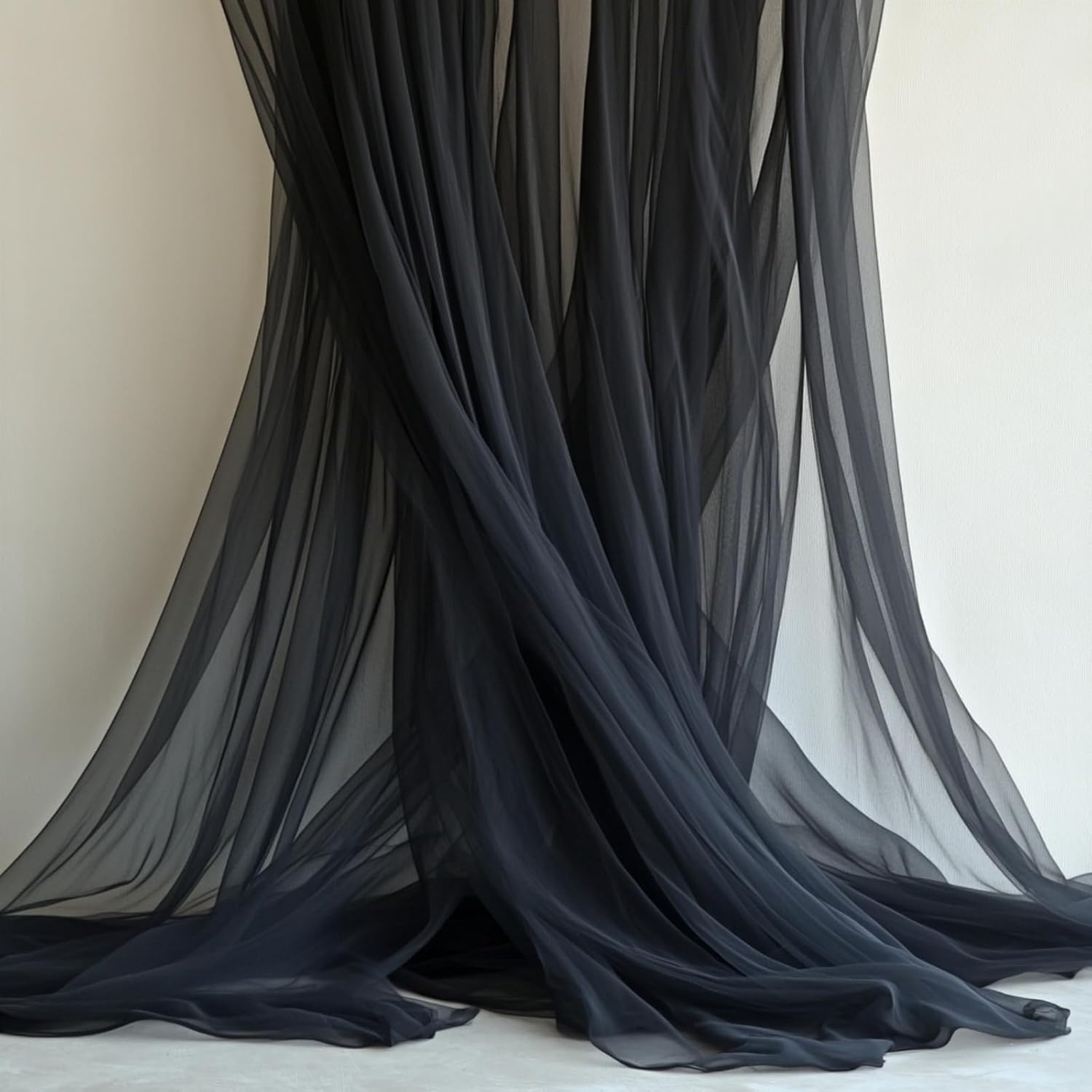 • Elegant Combination of Tulle Backdrop Curtains and Lights - Package Includes: 2 panels black sheer tulle backdrop curtains (5ft x10ft each, total 10x10ft).1 set of a 10x10ft warm white USB-powered tangle-free string lights (10 strands with 300 LEDs). 12 Transparent clips for hassle-free Installation. (Pro Tip: Buy multiple sets for fuller coverage and reduced sheerness!)