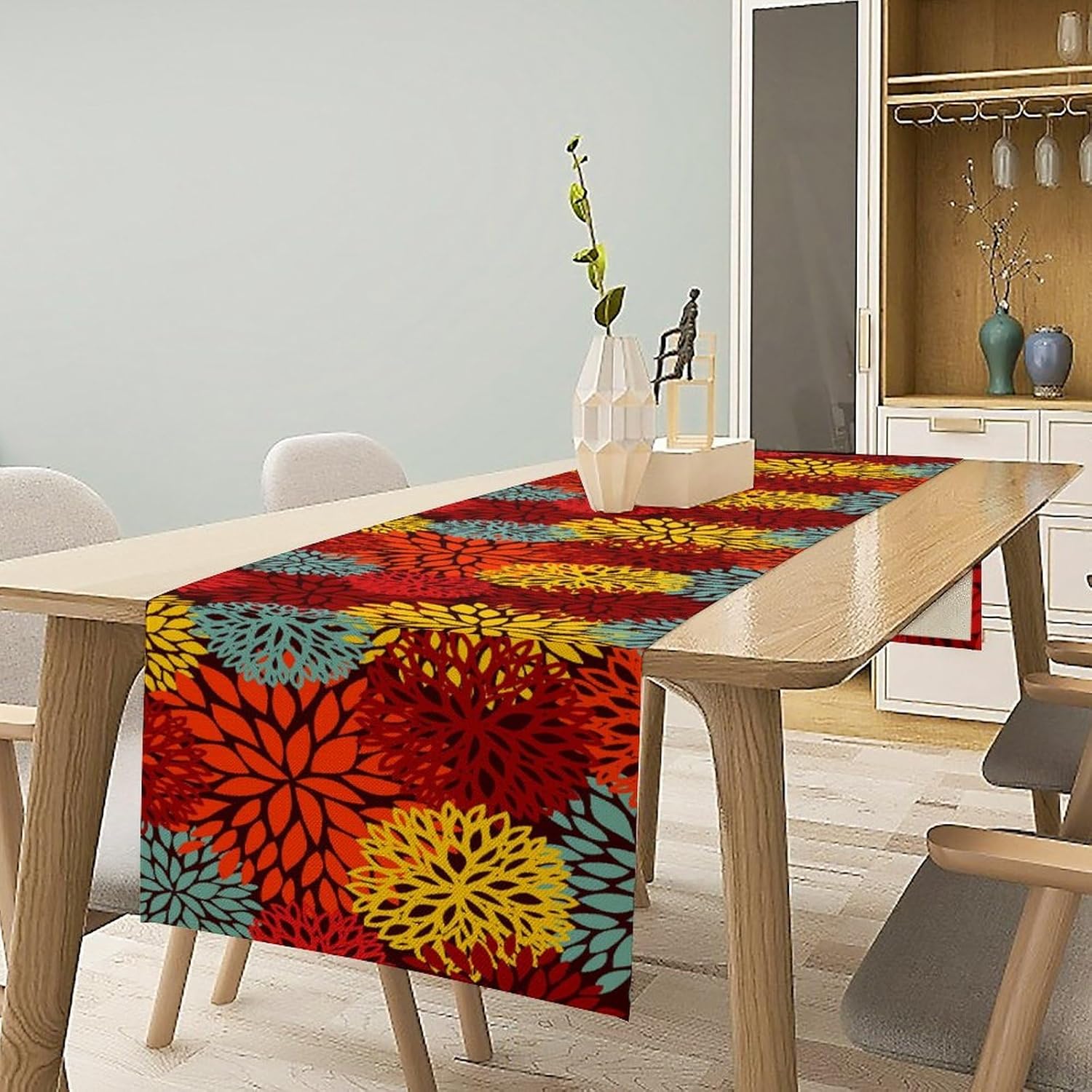 Red Yellow Dahlia Table Runner, Seasonal Autumn Thanksgiving Pattern Print for Home Kitchen Table Decor Dining Coffee Room Party Decor 13x90 Inch