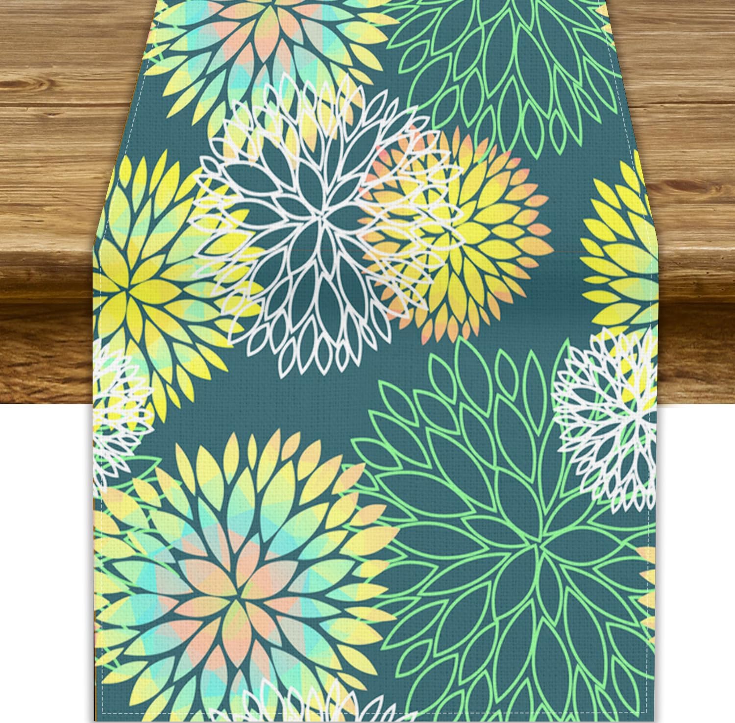 Green Dahlia Flower Table Runner, Linen Geometric Pattern Floral Table Decor Spring Farmhouse Decorations for Kitchen Dining Holiday Party Decor, 13x36 Inch