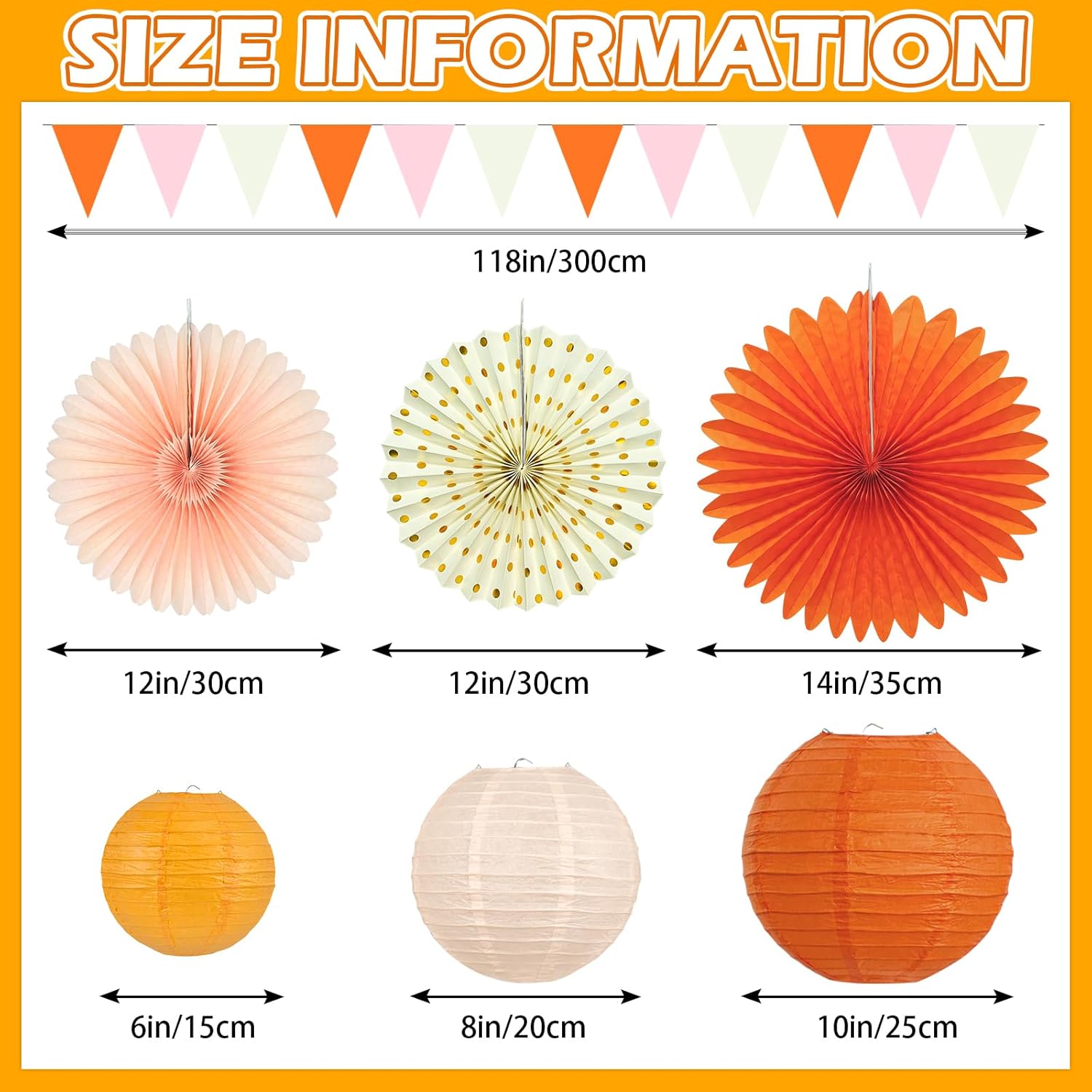 15Pcs Autumn Pink and Orange Party Decorations, Hanging Orange Paper Lanterns Honeycomb Paper Fans Triangle Flag Banner for Girls Women Baby Shower One Sweet Peach Birthday Thanksgiving Party Decor