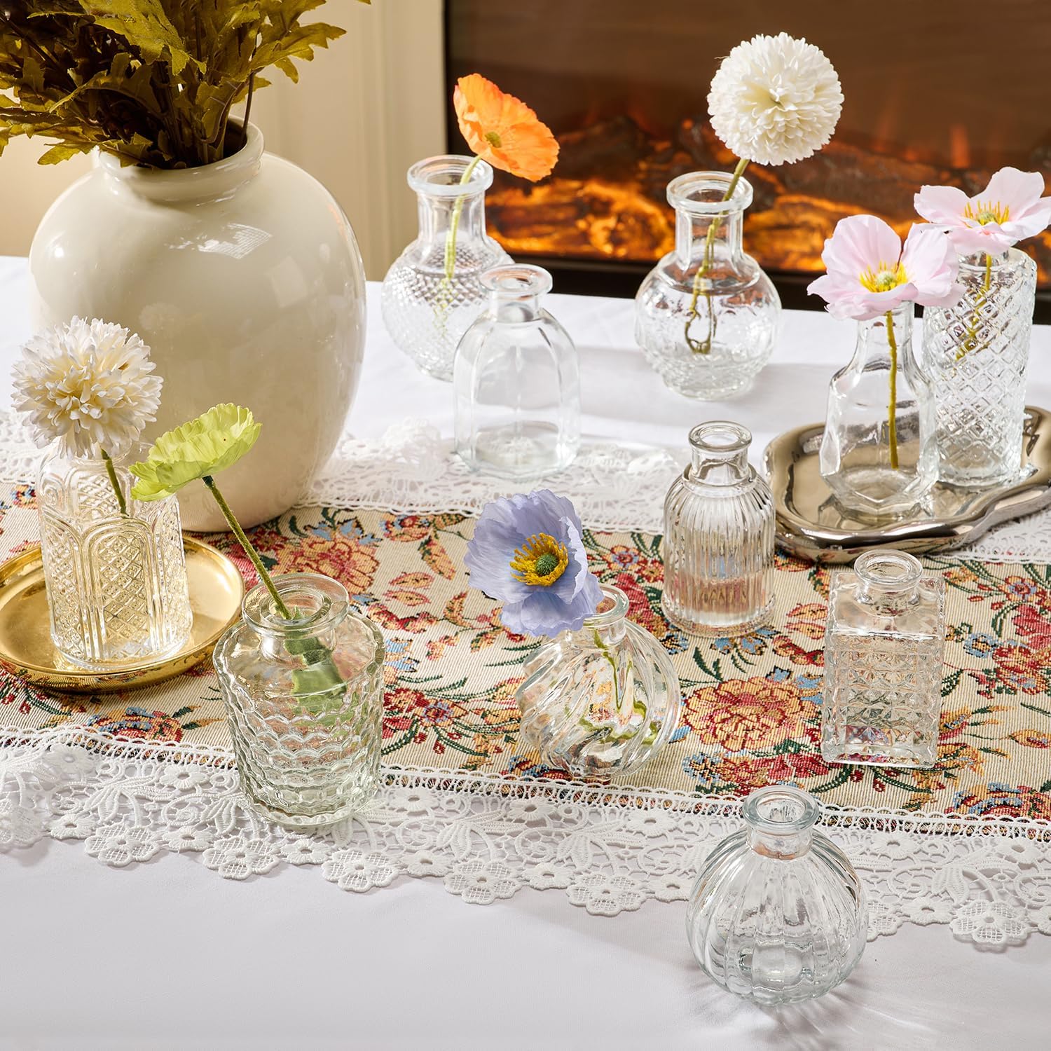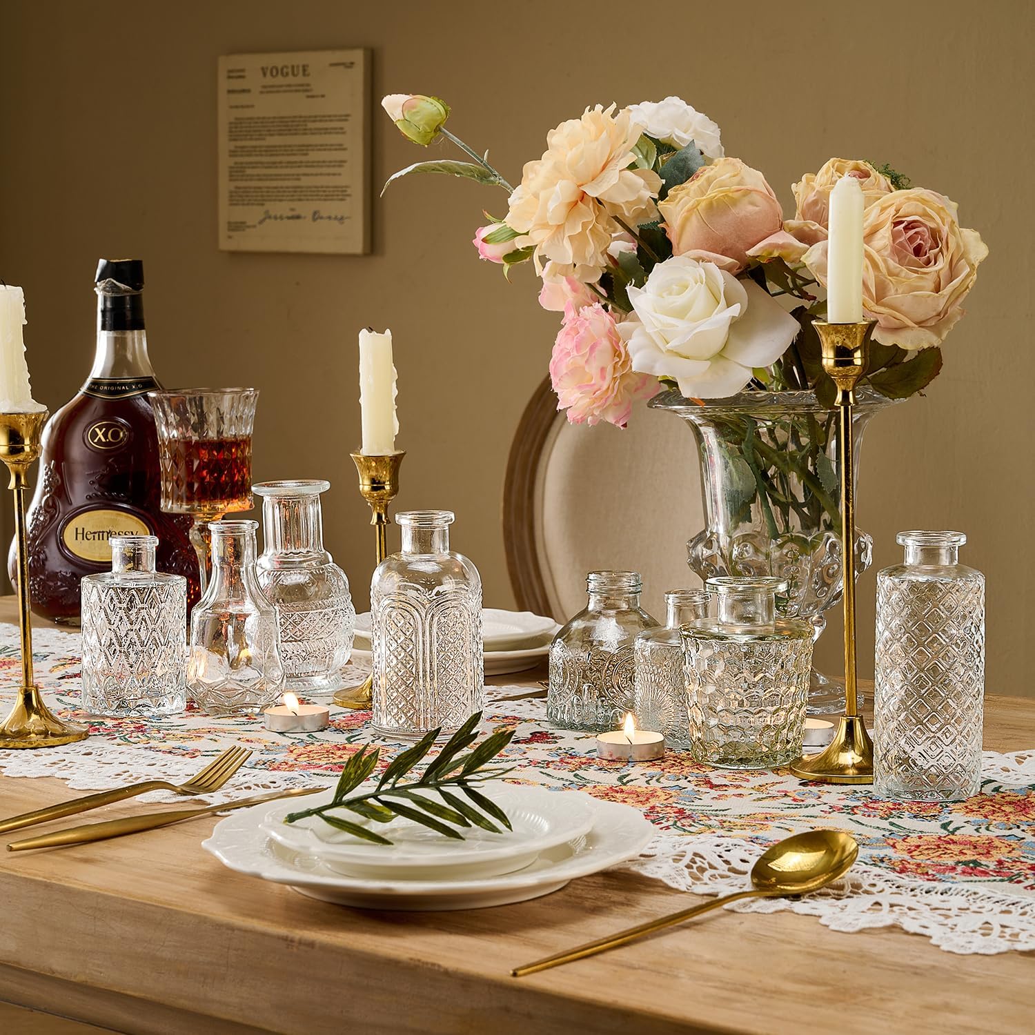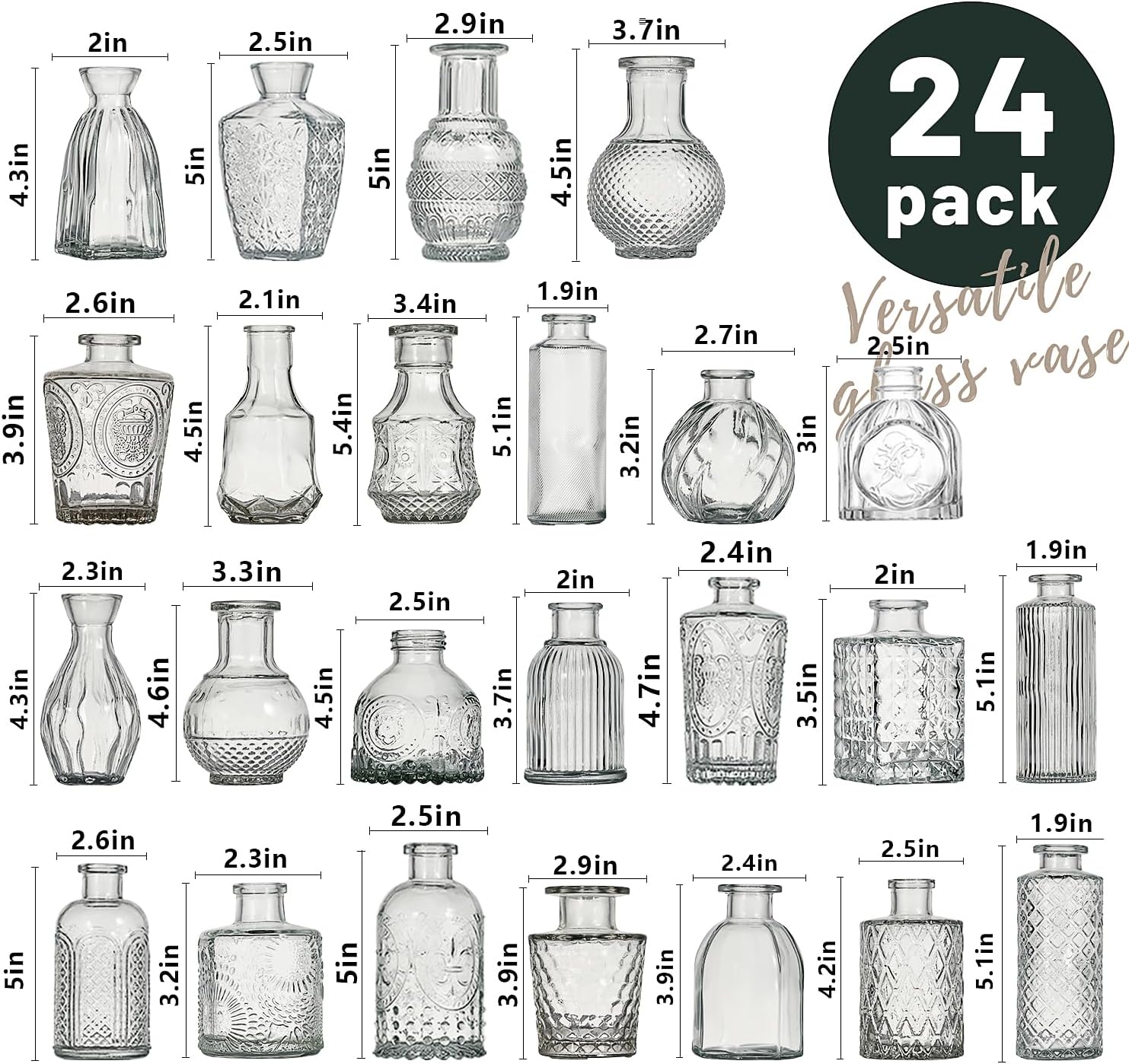 • Versatile Flower Bud Vase Set: This set comprises 24 diverse transparent glass flower bud vases, each adorned with etched designs to further elevate their charm. It is perfectly suited for any home décor. Whether placed as a centerpiece on dining tables, window sills, or wedding banquet tables, these small vintage crystal vases will lend an air of elegance to the setting.
