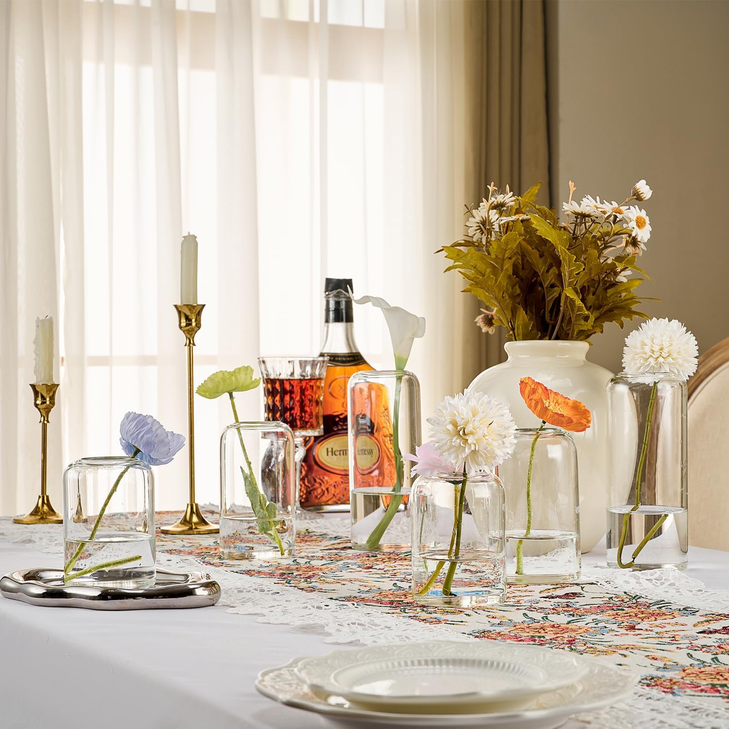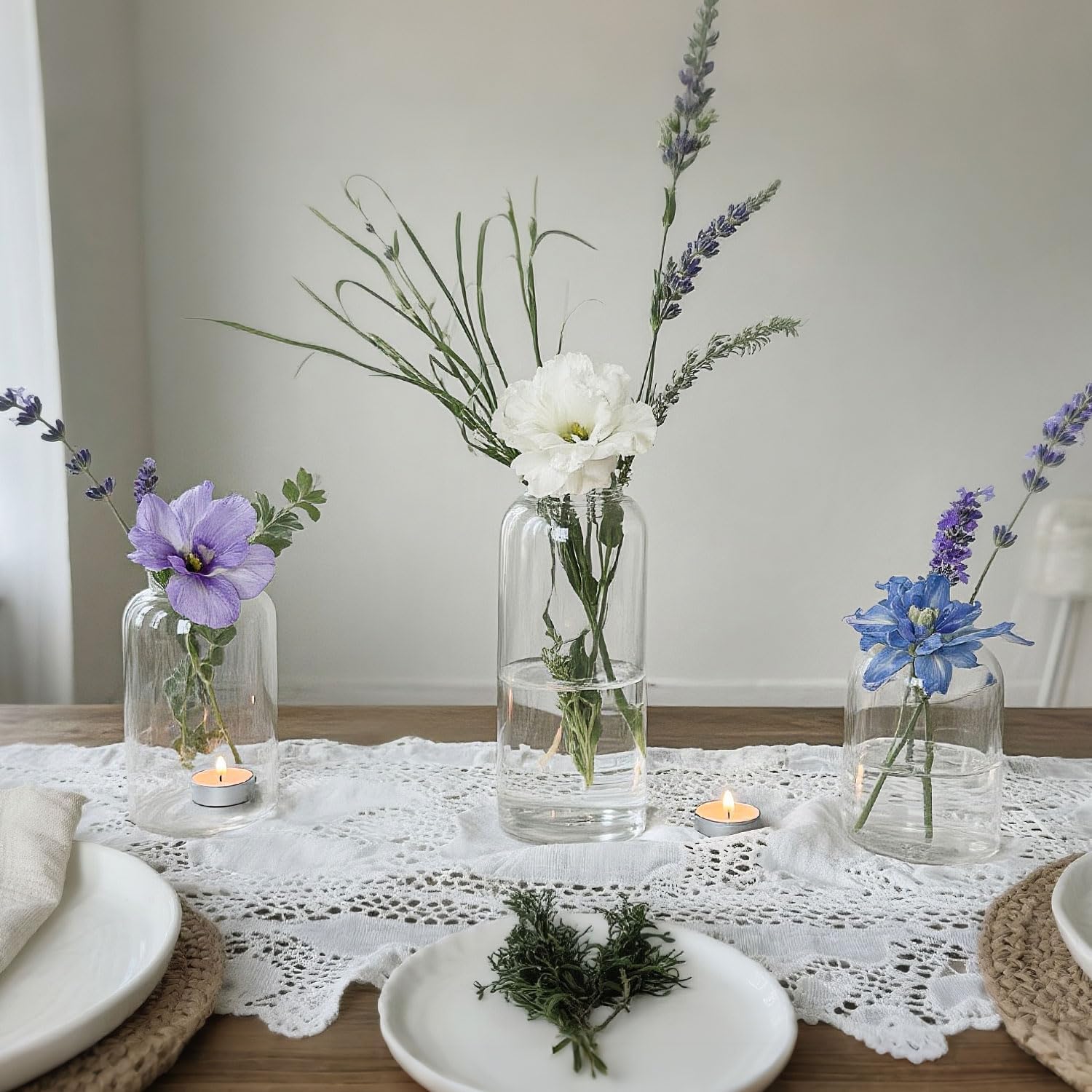 • Multi-Functional Vase Set‌: This set includes ‌3 cylindrical narrow-necked glass vases‌ in varying heights (3.9'', 4.9'', 6.7''), each with a ‌body diameter of 2.75‘’ and a ‌neck opening of 1.6‘’. Designed for versatility, they effortlessly adapt to: Floral arrangements‌ (fresh or dried stems) ‌Succulent planting‌ (miniature greenery displays) ‌Floating candle holders‌ (create ambient lighting) ‌Decorative displays‌ (shells, gemstones, or curated collections)