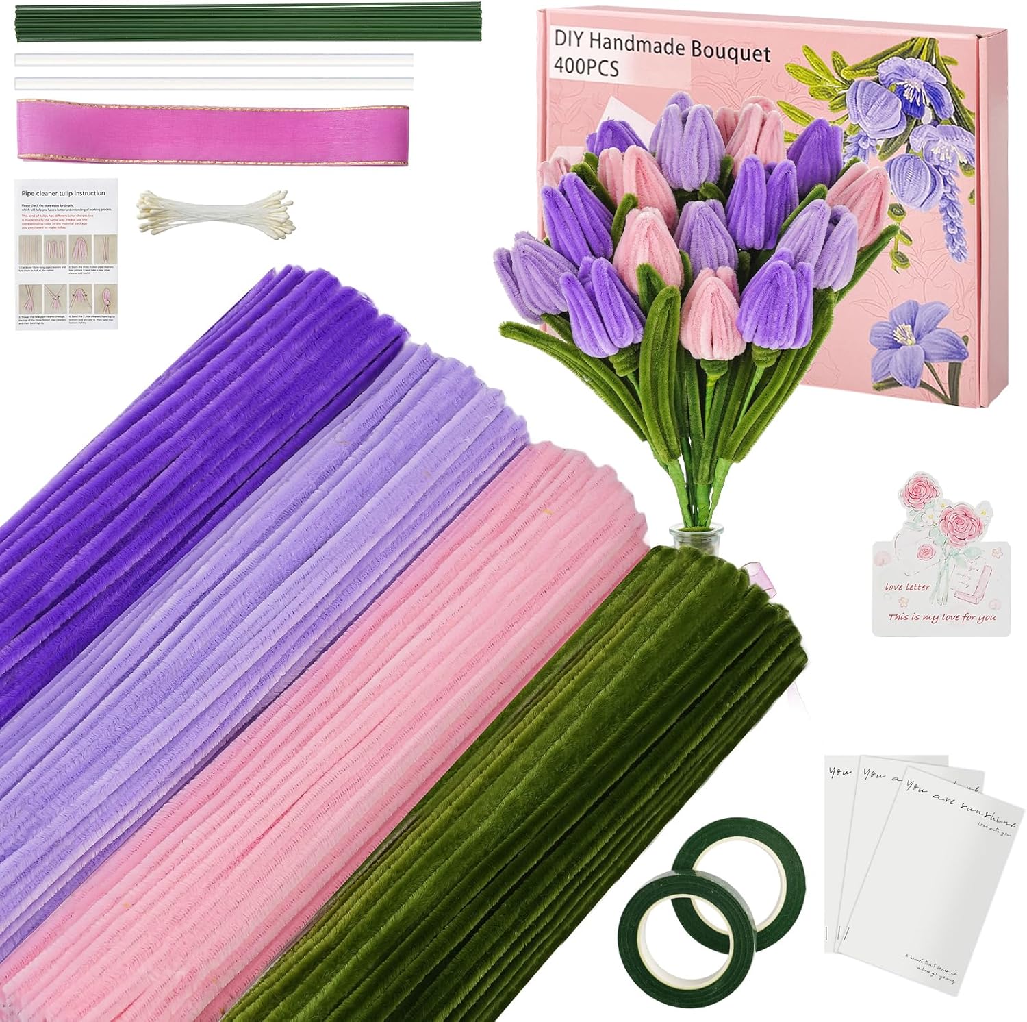 • 💐【Chenille Pipe Cleaners】The product includes all crafting accessories for tulip bouquets: 400pcs pipe cleaners,20pcs floral Wires, 2pcs gardening tapes,2pcs hot glue Sticks,1pc greeting card,3pcs bouquet papers, 1 bag stamen ,1pc Ribbon&1pc instruction.