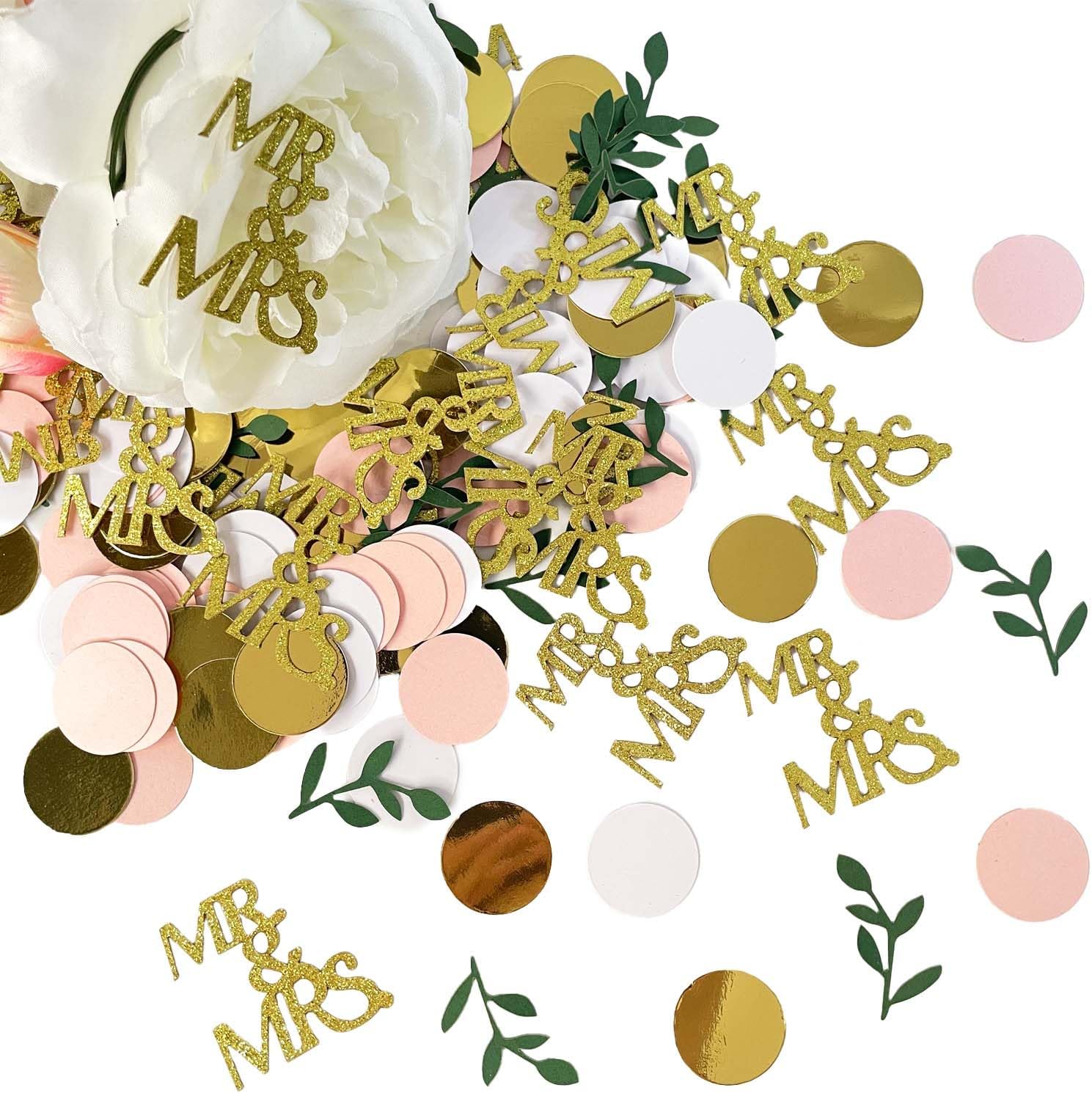 • PACKAGE INCLUDES-- gold glitter mr mrs table scatter, greenery Eucalyptus Confetti, gold conffeti dots, pink confetti dots, White confetti dots