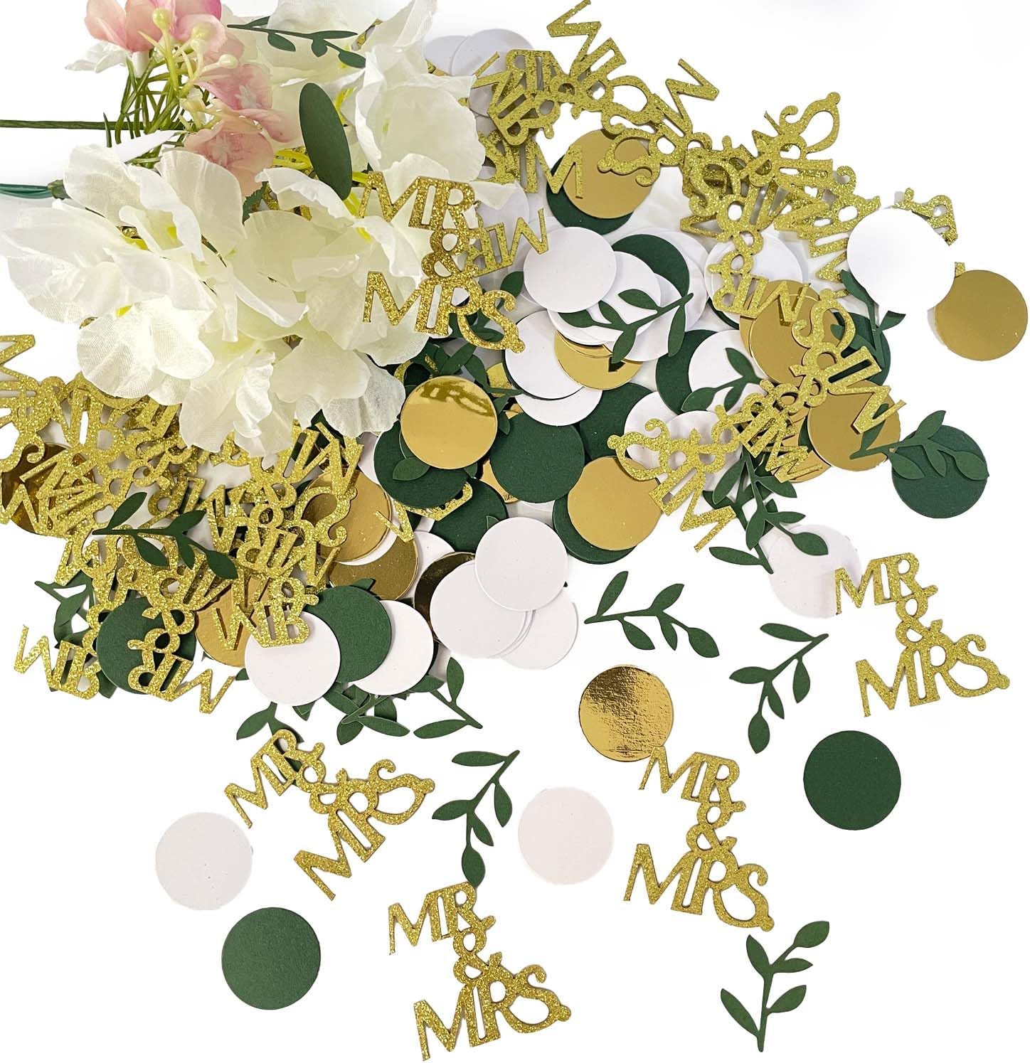 • PACKAGE INCLUDES-- gold glitter mr mrs table scatter, greenery Eucalyptus Confetti, gold conffeti dots, green confetti dots, White confetti dots