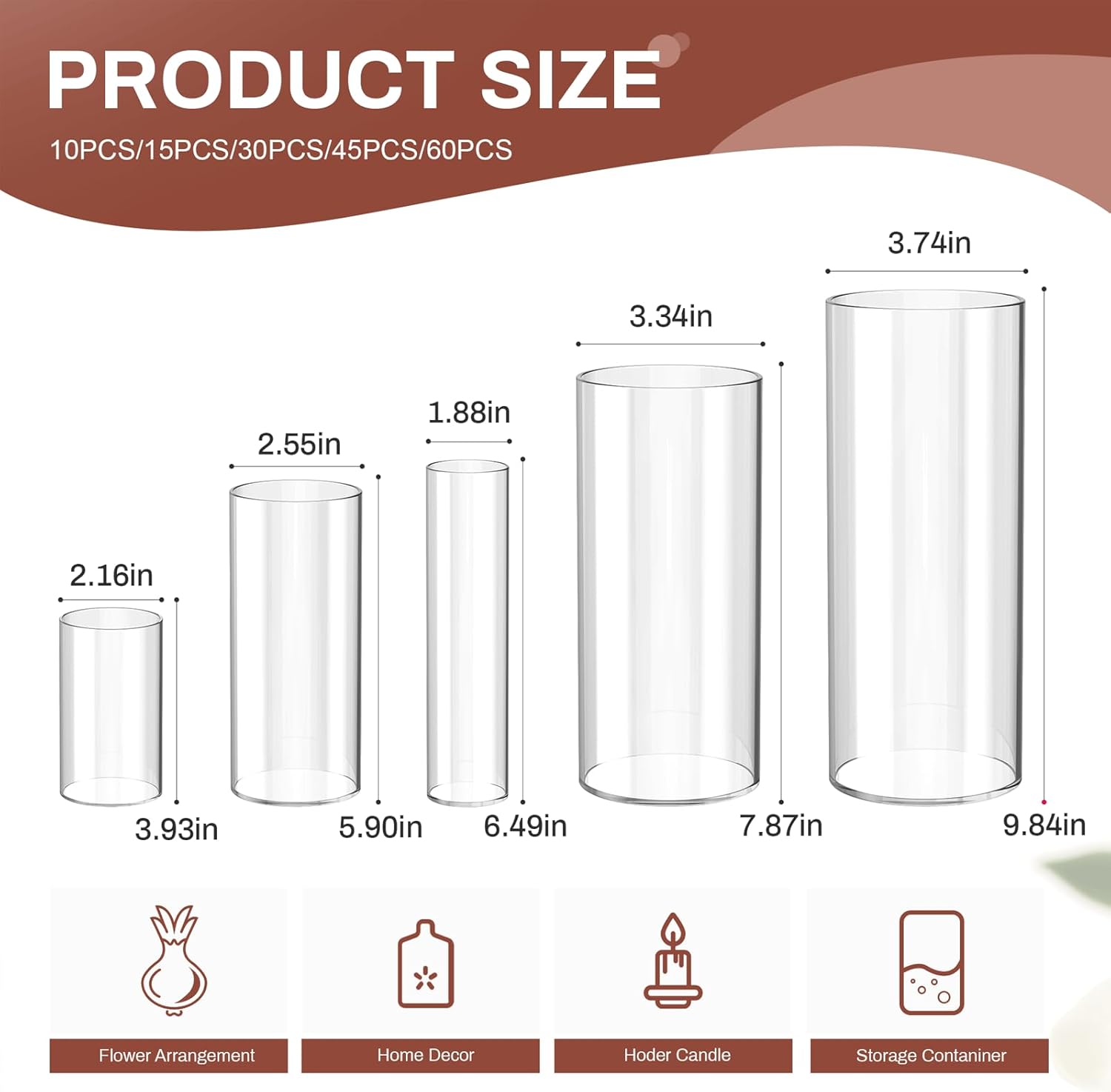 • 5-Size Cylinder Vase Set for Versatility​ From minimalist single stems (2.1×3.9 inchs) to lavish bouquets (3.7×9.8 inchs), 15 premium ​Cylinder vases​ in 5 sizes fit orchids, roses, or succulents.
