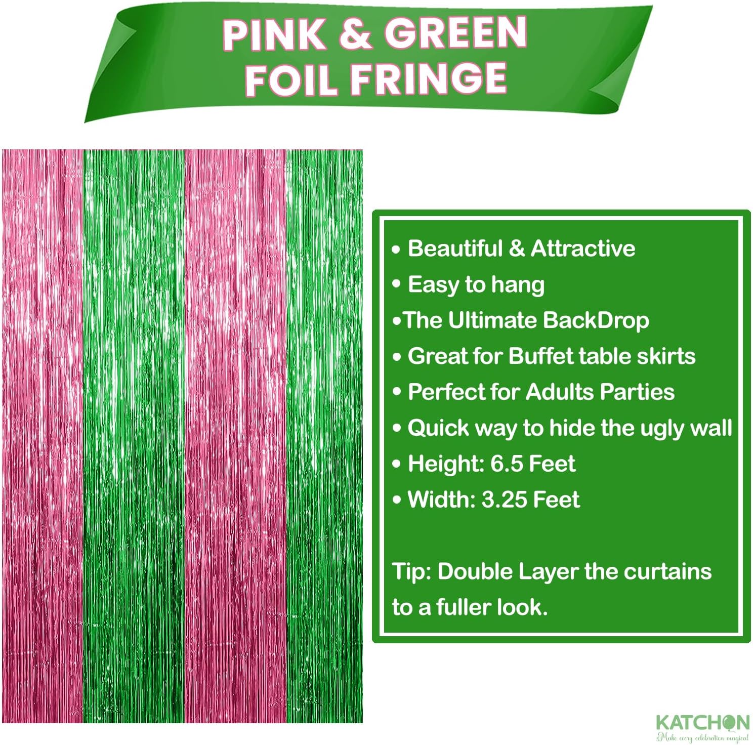 • 3.2X6.5 FT LARGE SIZE PACK OF 2 PINK AND GREEN FOIL FRINGE CURTAINS –: This pack includes pack of 2 pink and green foil fringe curtains made of shiny metallic foil. Each measures 3.2 ft wide by 6.5 ft tall, creating a vibrant pink and green backdrop for pink and green party decorations, green and pink birthday decorations, baby shower backdrop ideas, and princess birthday party decorations. Use as a pink tinsel backdrop, pink fringe, tassel backdrop, or party streamers backdrop.