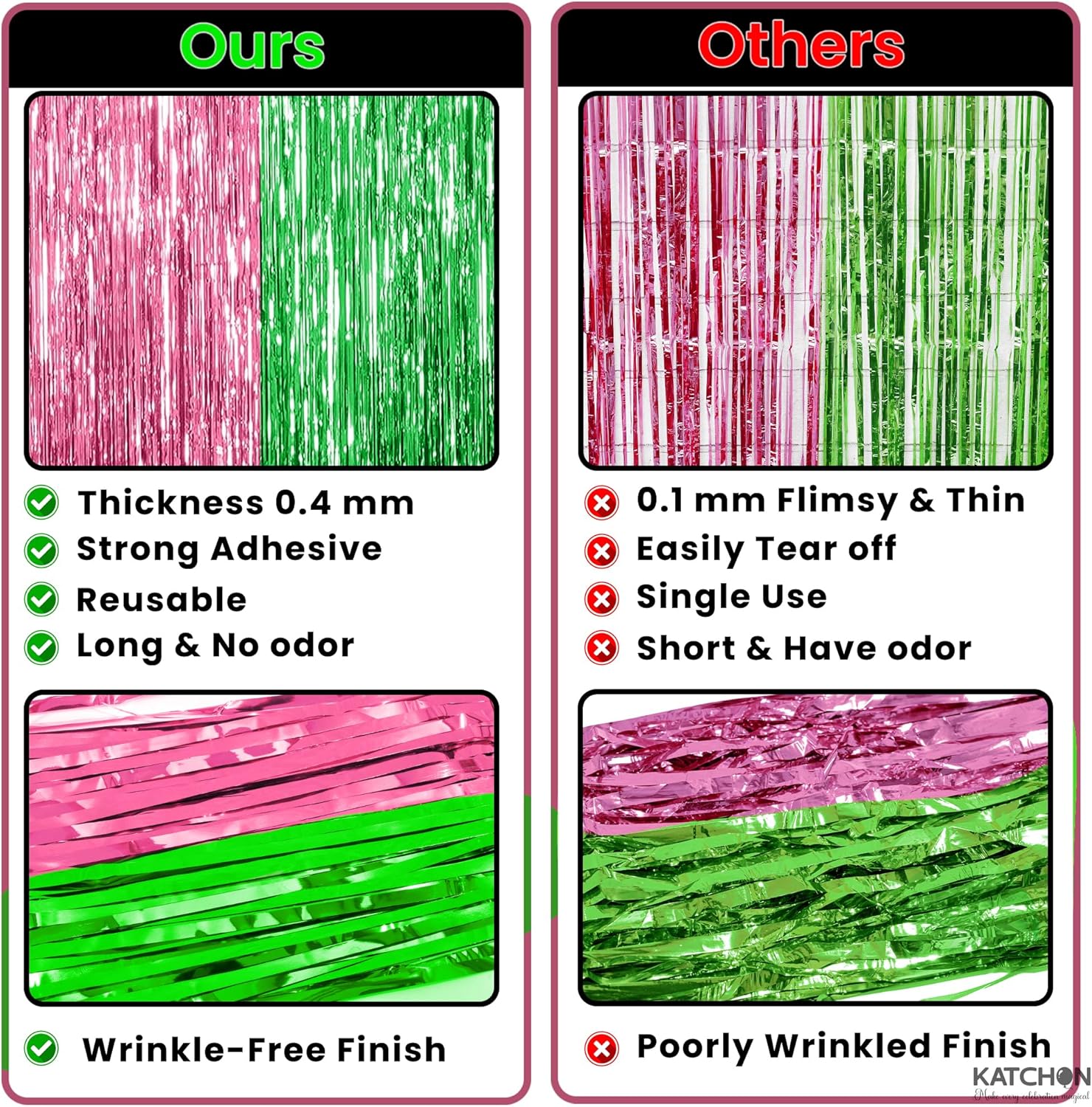 • STURDY AND REUSABLE | HIGH QUALITY – This spooky pink and green foil fringe curtain is the perfect green and pink party decorations. Everybody will surely love taking selfies in front of these wicked party decorations. Also use this for baby shower backdrop walls, green and pink birthday decorations, princess birthday party decorations, or dessert table backgrounds, Wicked Birthday Decirations. The metallic foil adds sparkle to kids' birthdays, bachelorette nights, or halloween party decorations. Use as a party fringe backdrop, fringe door curtain party, foil streamer backdrop, green foil fringe, pink foil fringe, or metallic fringe backdrop.