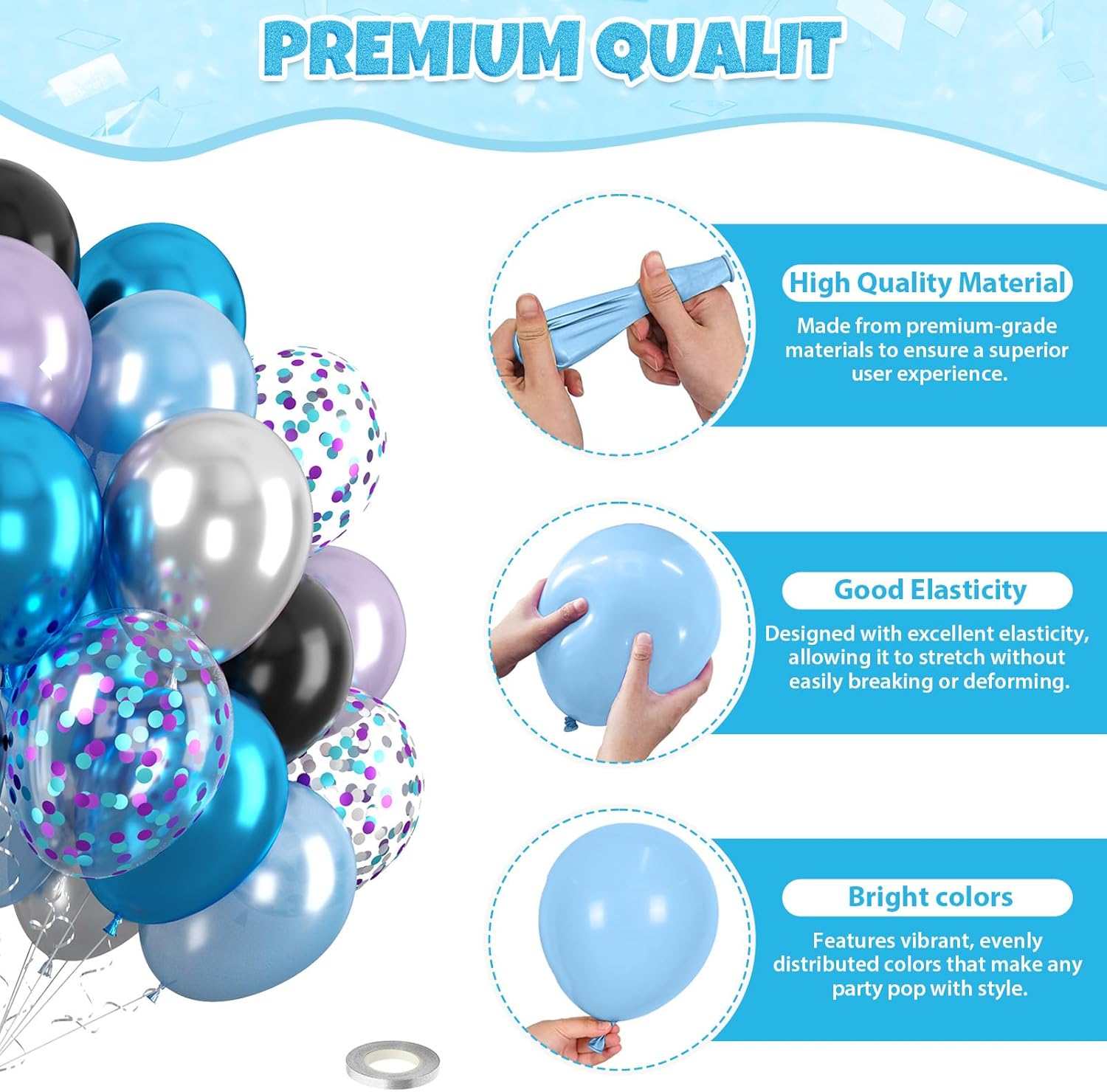 • All-in-One Set: This blue black purple balloons kit includes 36pcs pearl balloons(pearl light purple, pearl dark blue, pearl black), 16pcs metallic balloons(metallic silver, metallic blue), 8pcs teal blue purple confetti balloons, and 1pc silver ribbon. Whether it’s a birthday bash or bridal shower, the thoughtful color combo, suitable for adding a fun, modern touch to any celebration.
