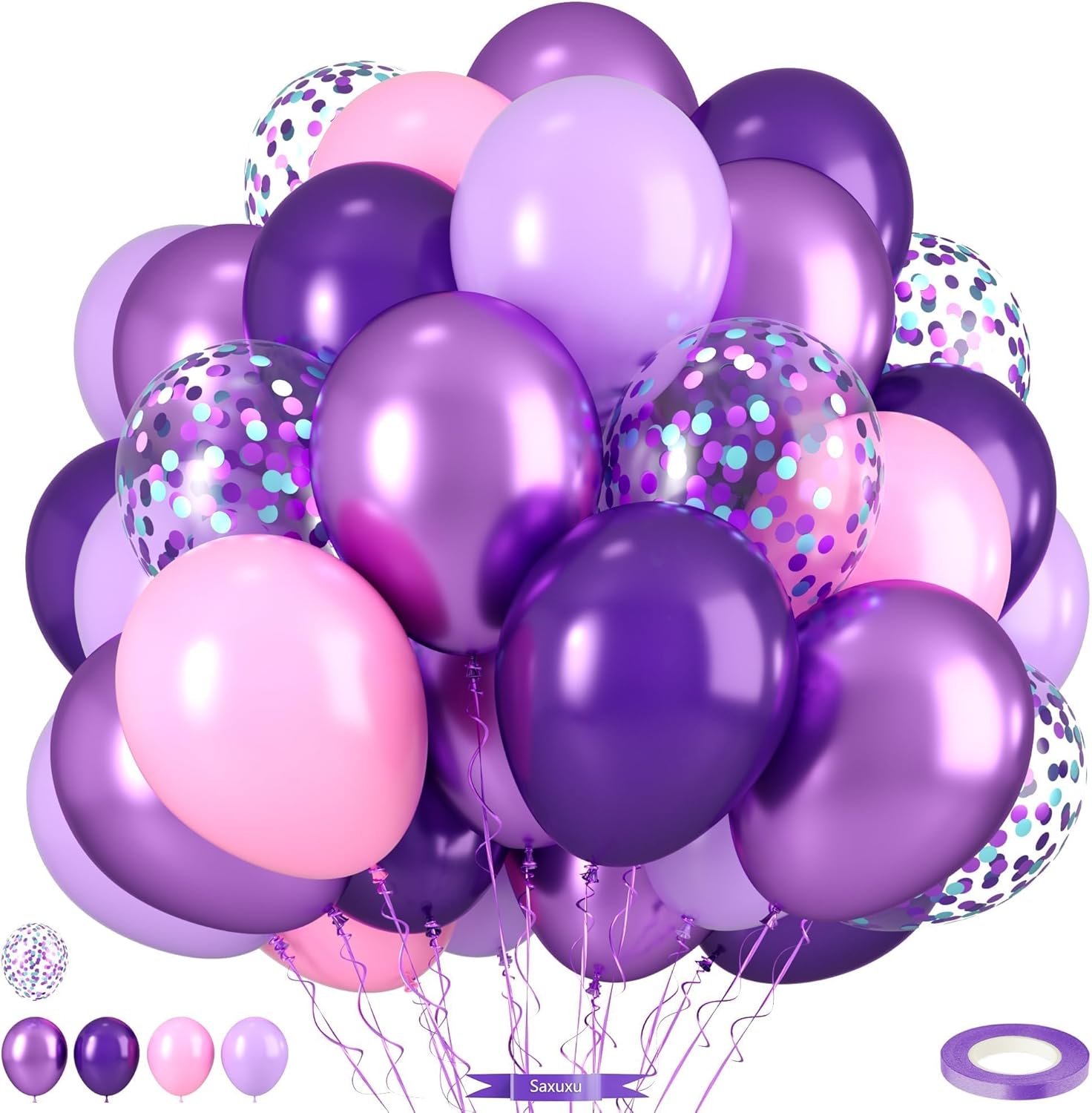 • 【12 Inch Purple and Pink Balloons Set】Macaron pink balloons (8 pcs),metallic purple balloons (3 pcs),dark purple balloons (8 pcs),light purple balloons (8 pcs),purple confetti balloons (3 pcs),purple balloon ribbon (1 roll), 30pcs in our purple birthday latex balloons set. Suitable for decorating various occasions, such as pink and purple theme party birthday baby shower anniversary graduation wedding.