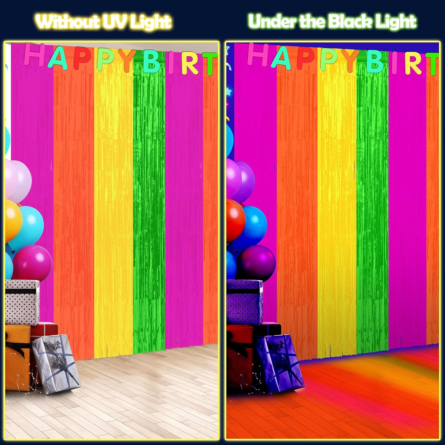 • What’s Inside: Included in the package are 4 glow in the dark foil fringe curtains in orange, yellow, hot pink and green colors, each measuring 3.3 x 6.6 ft, making them suitable for decorating most scenes. Perfect for creating an impressive neon backdrop for neon birthday party decorations and glow in the dark party supplies