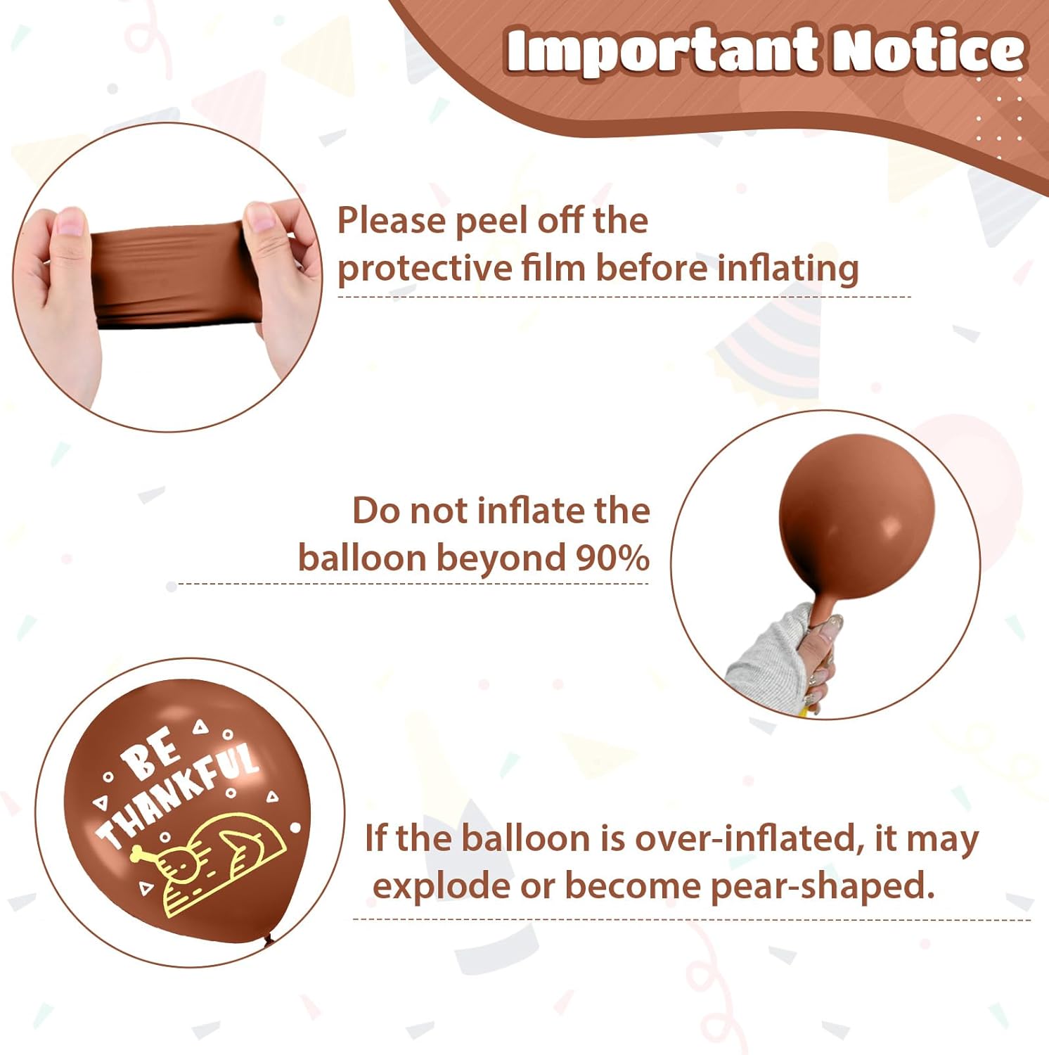 • 【Easy to Assemble】Our brown and yellow balloons set can be easily inflated with air or helium. Use a pump for quick setup. Secure them with the provided ribbons for a polished look. You can DIY any style you desire, sticking thanks giving balloons to doors, walls, ceilings, and anywhere else you wish to decorate.