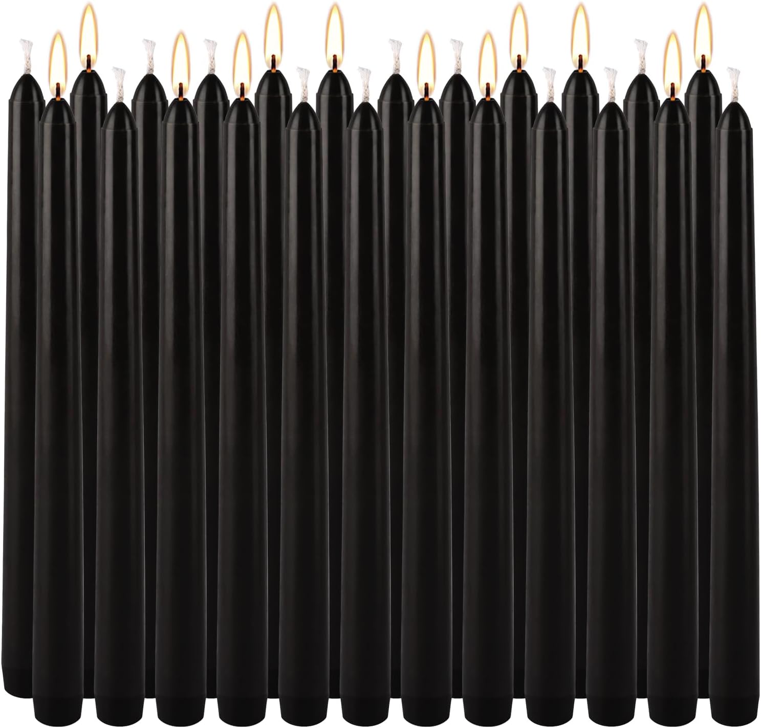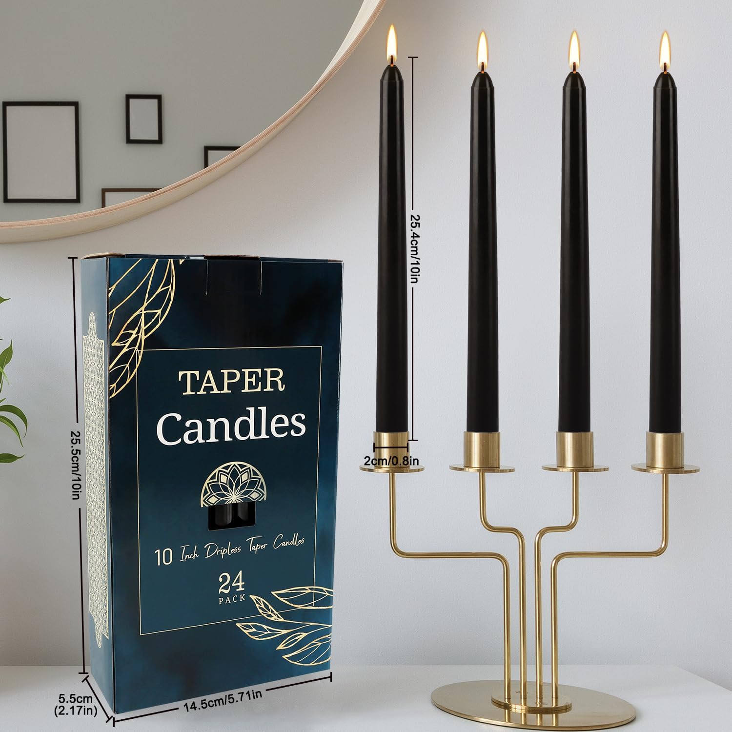 24 Pack Black Taper Candles, 7-8 Hours Burn Time, Unscented, Smokeless and Dripless, 10 Inch Dinner Candle Set for Household, Wedding, Party and Home Décor Candlesticks.