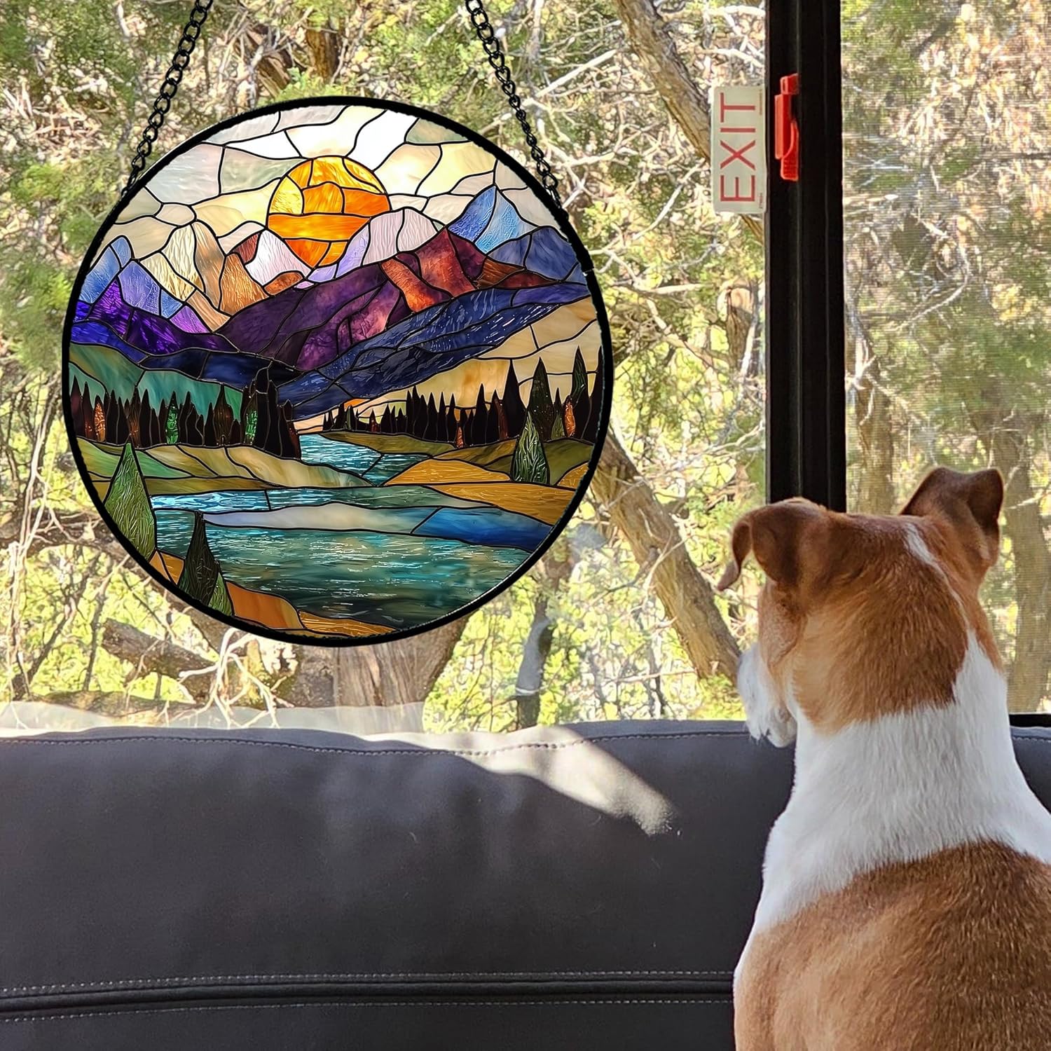 Stained Glass Window Hanging, Blue Lake Golden Sun Abstract Mountains Landscape Suncatcher for Doors Window Home Sun Catchers Decor Mother's Day Birthday Gifts for Women Men Mom 15 in