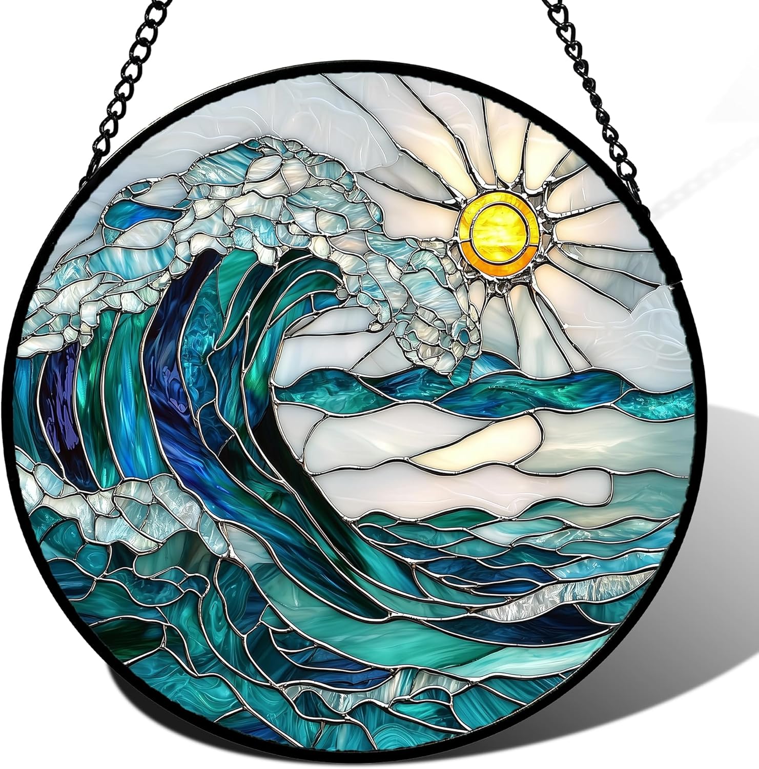 Stained Glass Window Hanging - Blue Green Waves Suncatcher for Door Terrace Garden Home Decor Sunrise Over The Sea Sun Catcher Birthday Gifts for Lovers Women Men Dad Mom Nana 11.8 in