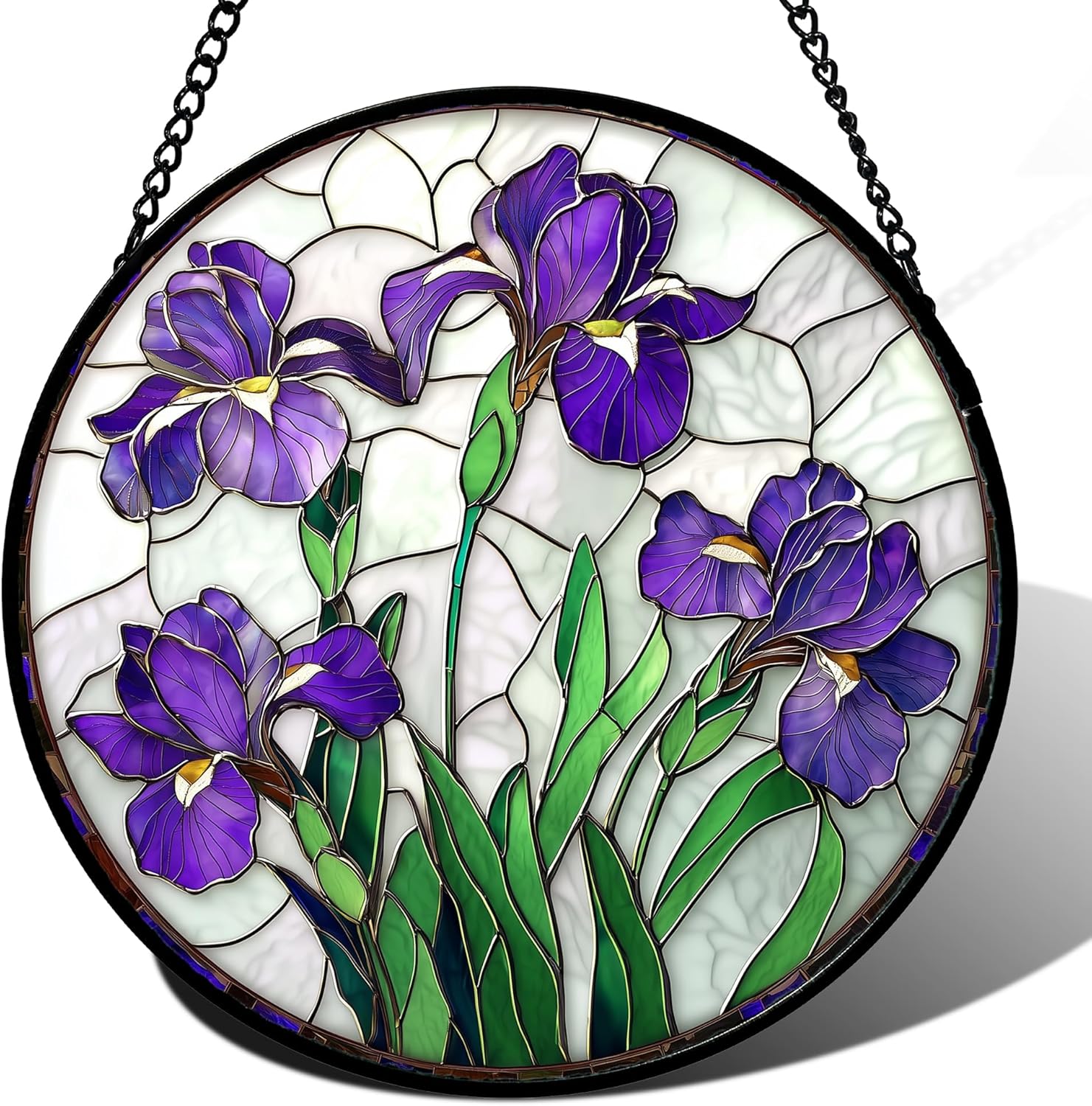 Stained Glass Window Hanging - Purple Iris Flower Sun Catcher for Door Terrace Garden Home Decor, Green Plants Suncatcher Birthday Gifts for Lovers Women Men Dad Mom Nana 11.8 in