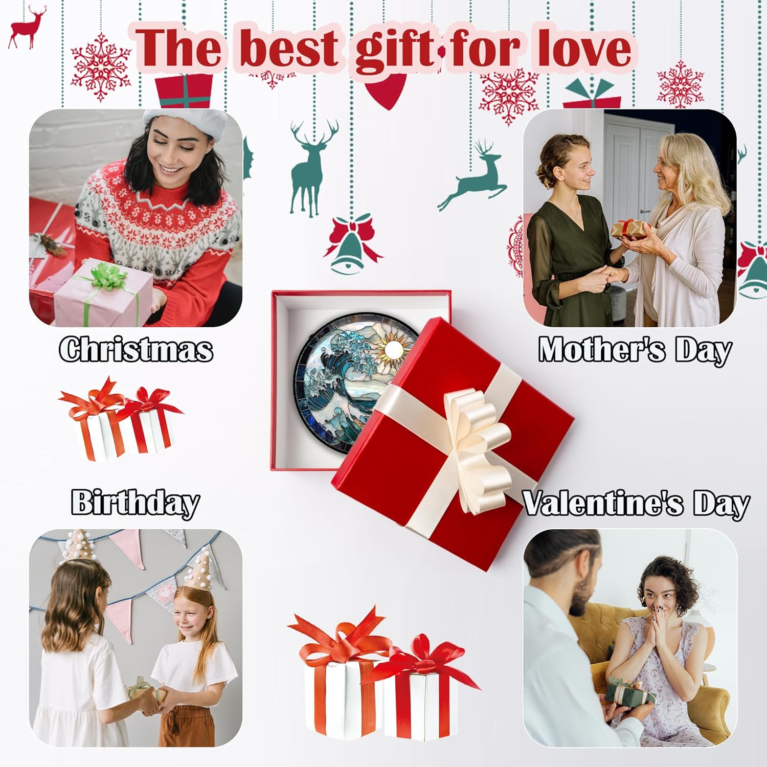 Stained Glass Window Hanging - White Sun Big Wave Suncatcher for Door Terrace Garden Home Decor Blue Ocean Landscape Sun Catcher Birthday Gifts for Lovers Women Men Dad Mom Nana9.8 in
