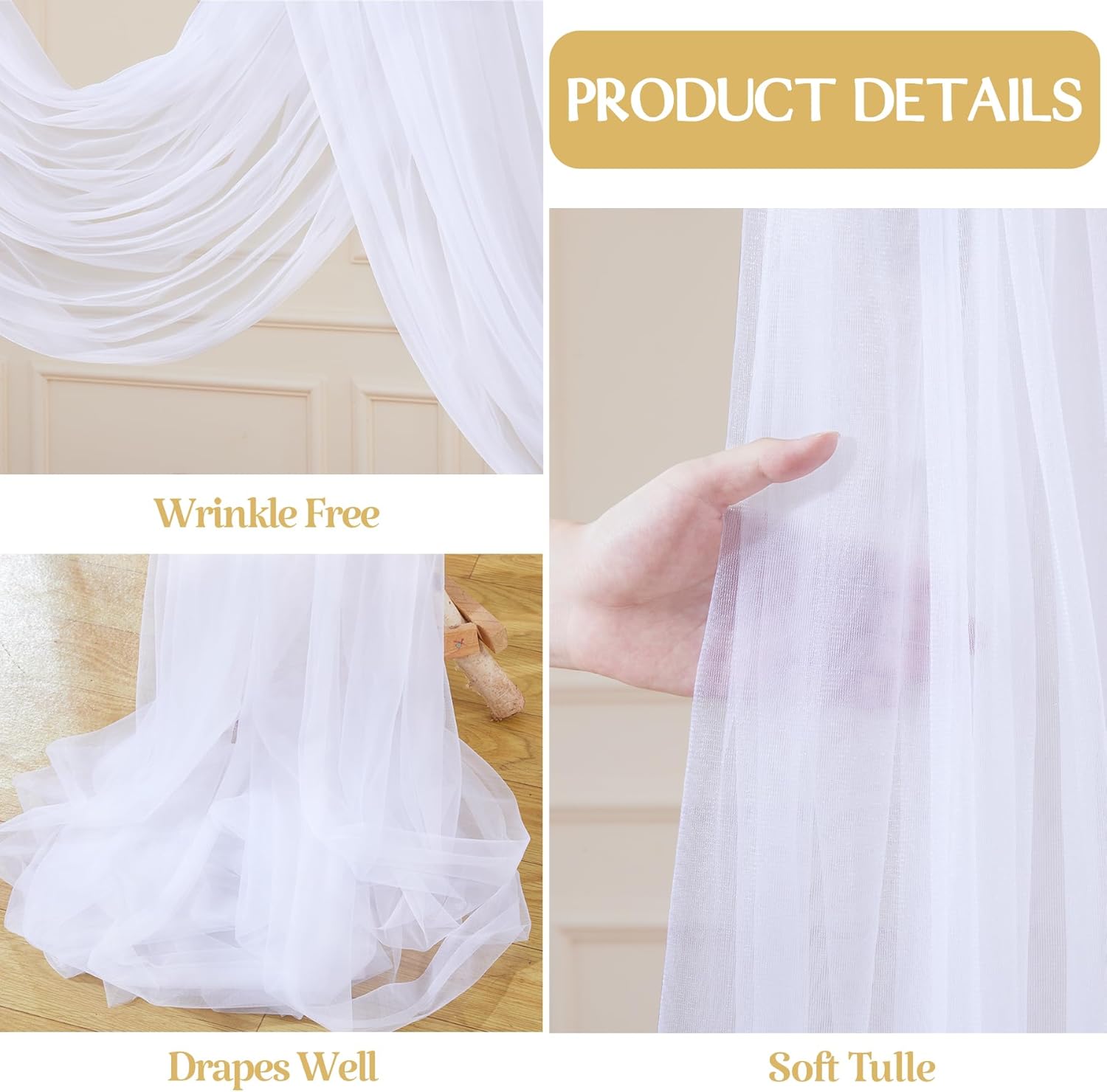• Premium Chiffon Fabric for Draping: Made of high-quality polyester tulle, this fabric is soft, wrinkle-resistant, and durable. The naturally cascading hem forms beautiful layered folds, gracefully draping over your arch to add a dreamy, romantic ambiance—perfect for enchanting wedding photo backdrops