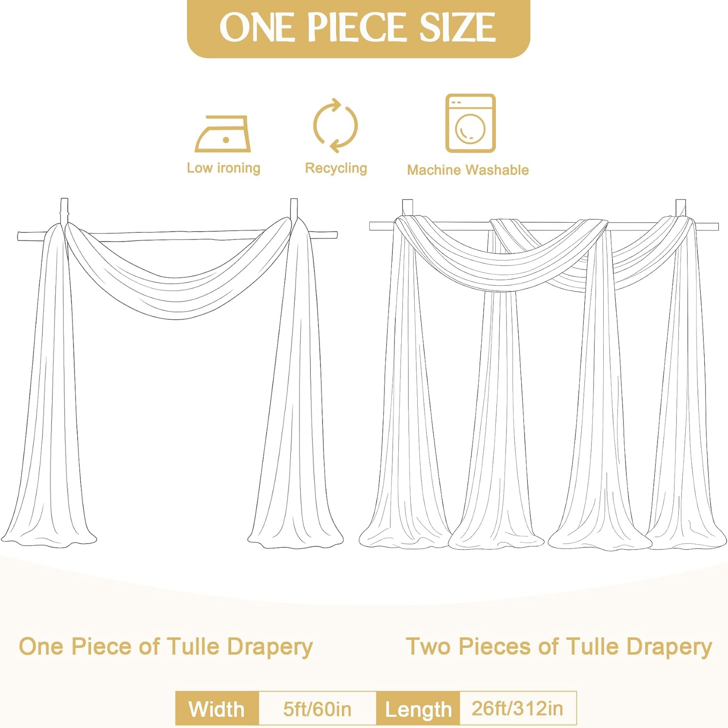 • Wedding Arch Drapes Package Includes: 2 pieces of wedding arch draping fabric, size: 60 inches x 26 feet. This extra-long arch draping fabric features a seamless one-piece design, perfectly fitting most standard arch shapes (round/hexagonal/square) and canopy structures. No need for cumbersome splicing, simply hang it up to effortlessly create smooth, elegant draping effects