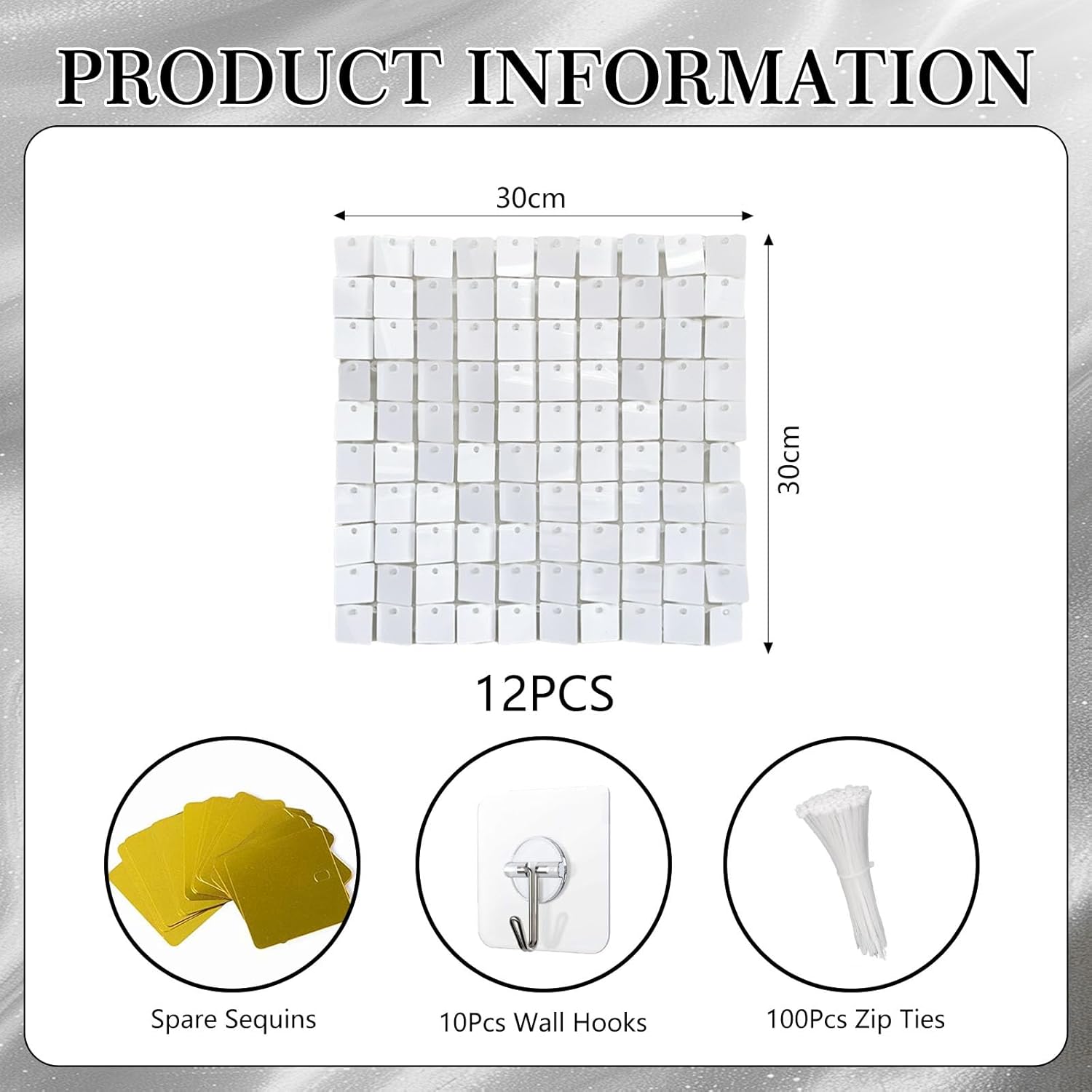 • 【Package Includes】Each box includes 12 white wall panels (12"x 12" each). We provide enough zip ties (100 pcs), a pack of spare sequins, and wall hooks (10 pcs) to support the weight of the wind panel, as well as an installation manual. 12pcs can cover 3x4ft place. More boxs will cover a larger area and have a fuller look.