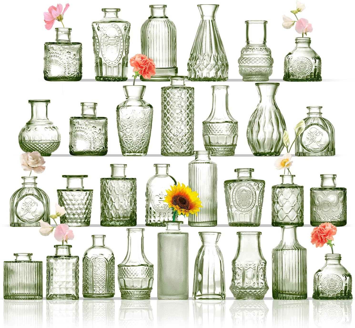 Bud Vases in Bulk 30, Green Glass Bud Vases for Centerpieces, Small Vase for Flowers, Mini Vintage Flower Vase for Centerpieces, Wedding Table Decor, Home Decor