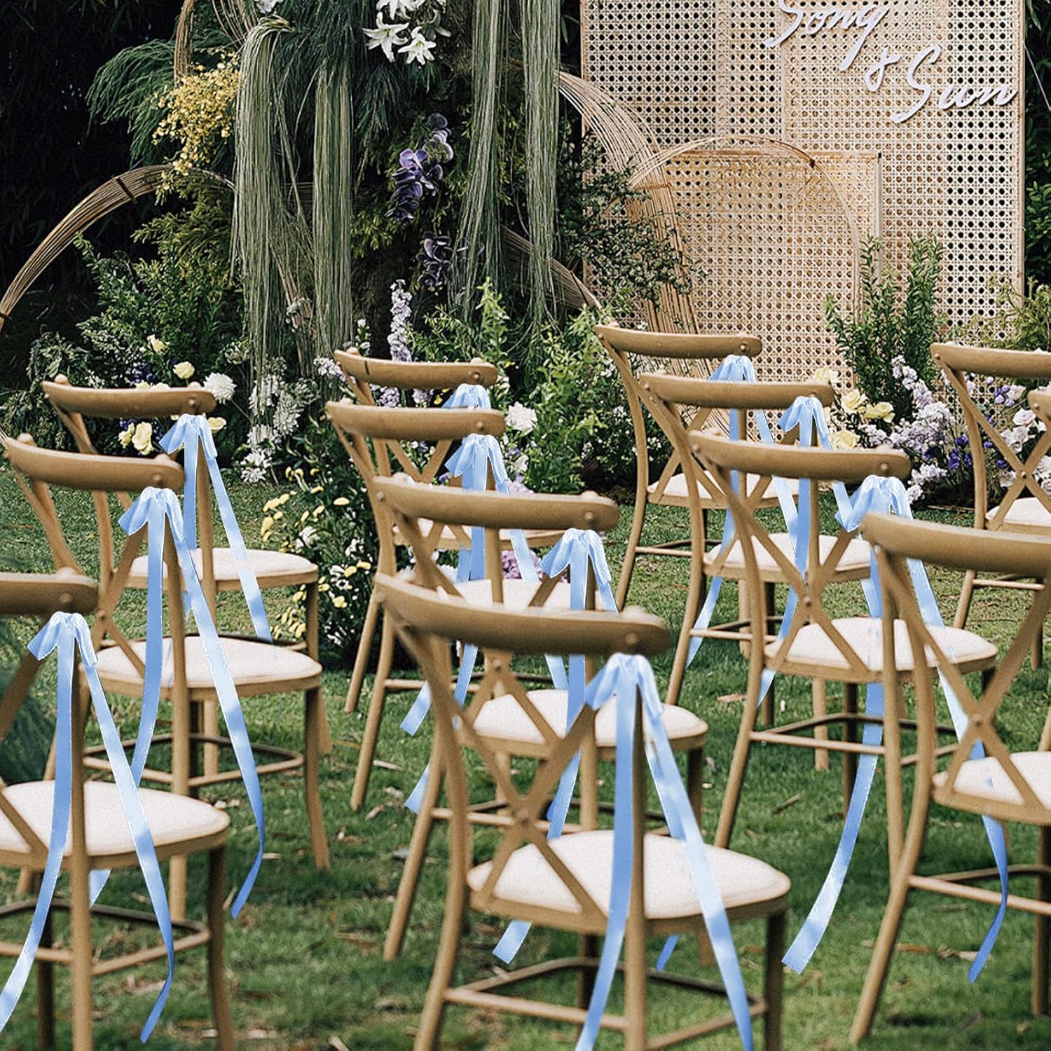 • Lightweight yet luxurious: these delicate chair bows sway gently with every breeze, weaving a dreamy atmosphere into your special day. Made from high-quality ribbon, they combine ethereal beauty with lasting resilience, adding a whisper of romance to weddings or elegant gatherings.