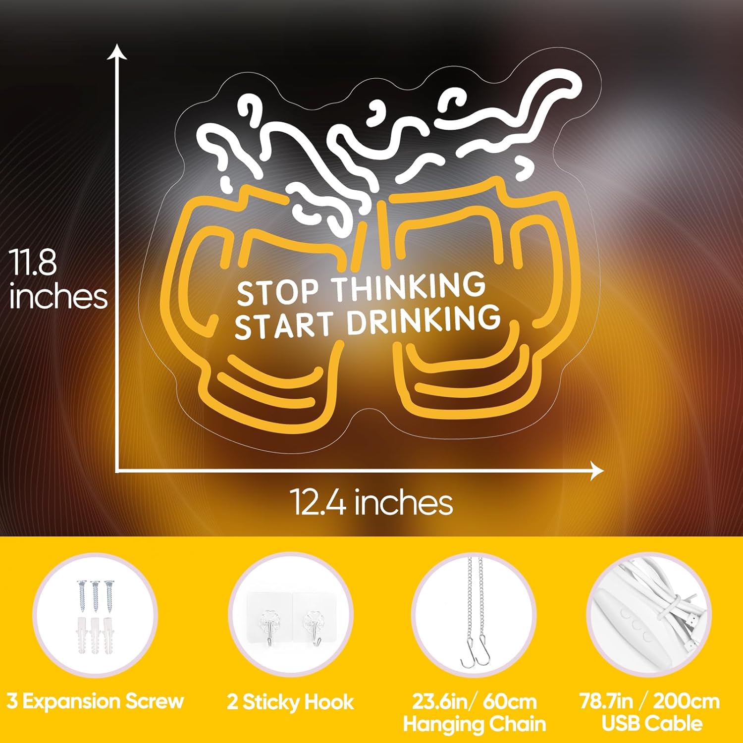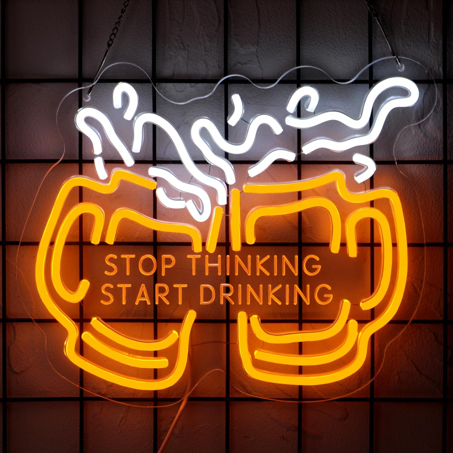 • 【Beer Neon Sign Decoration】This beer cheers neon sign with the words "Stop Thinking, Start Drinking" engraved in the middle is suitable for decoration in bars, clubs, and other places, allowing people in the bar to forget all their troubles and immerse themselves in this night full of beers and lights.