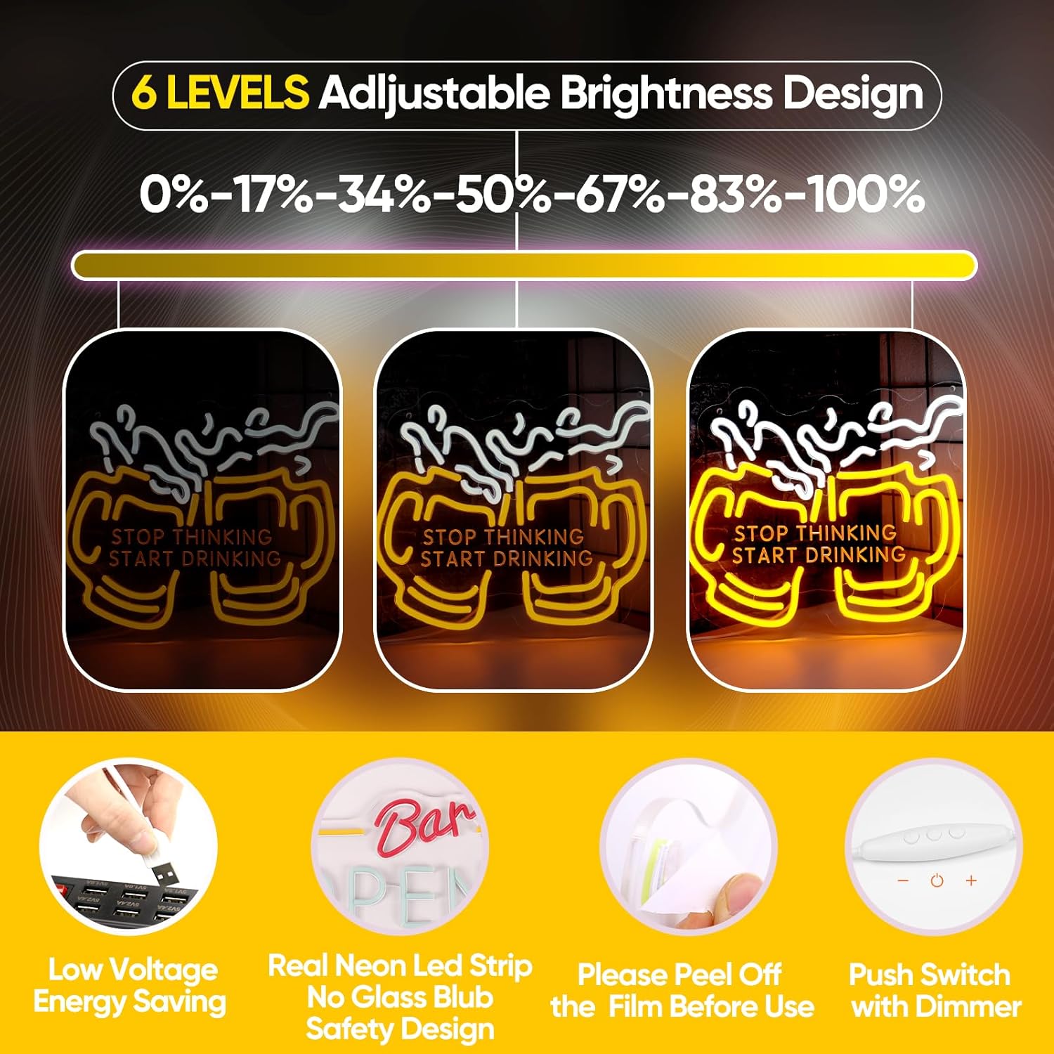 • 【USB Power Supply & Dimming Switch】The neon beer sign uses a secure USB (which can be connected to a PC, charger, or power bank) to light up the beer cheers sign. The Stop Thinking Start Drinking neon lights have a dimmable switch ON/OFF power cord, allowing you to freely adjust the brightness and create the atmosphere you like.