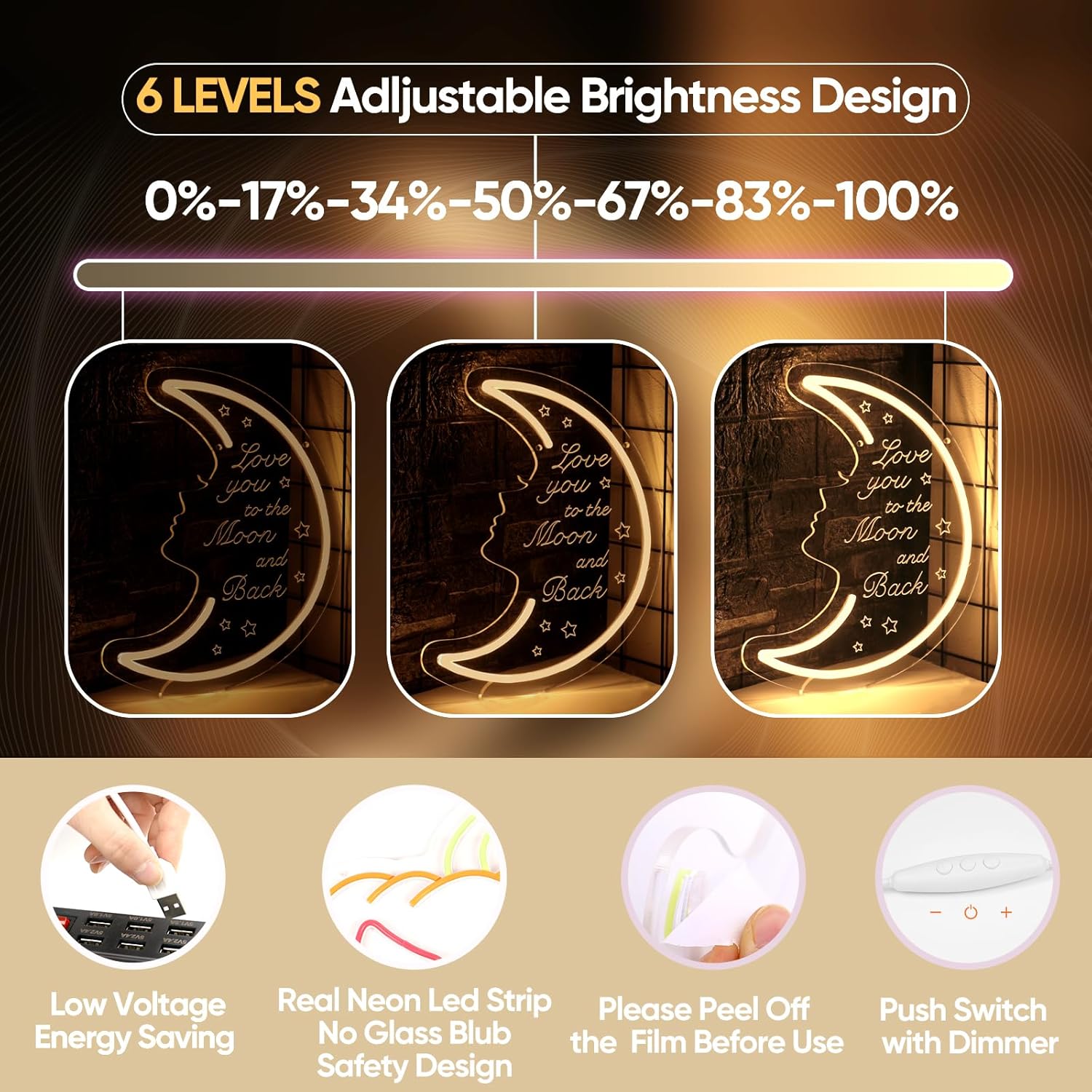 Moon Neon Light Sign for Wall Decor, 5v USB Powered & Dimmable Love You to the Moon and Back LED Light for Girls Kids Bedroom Living Room Home Party Decor