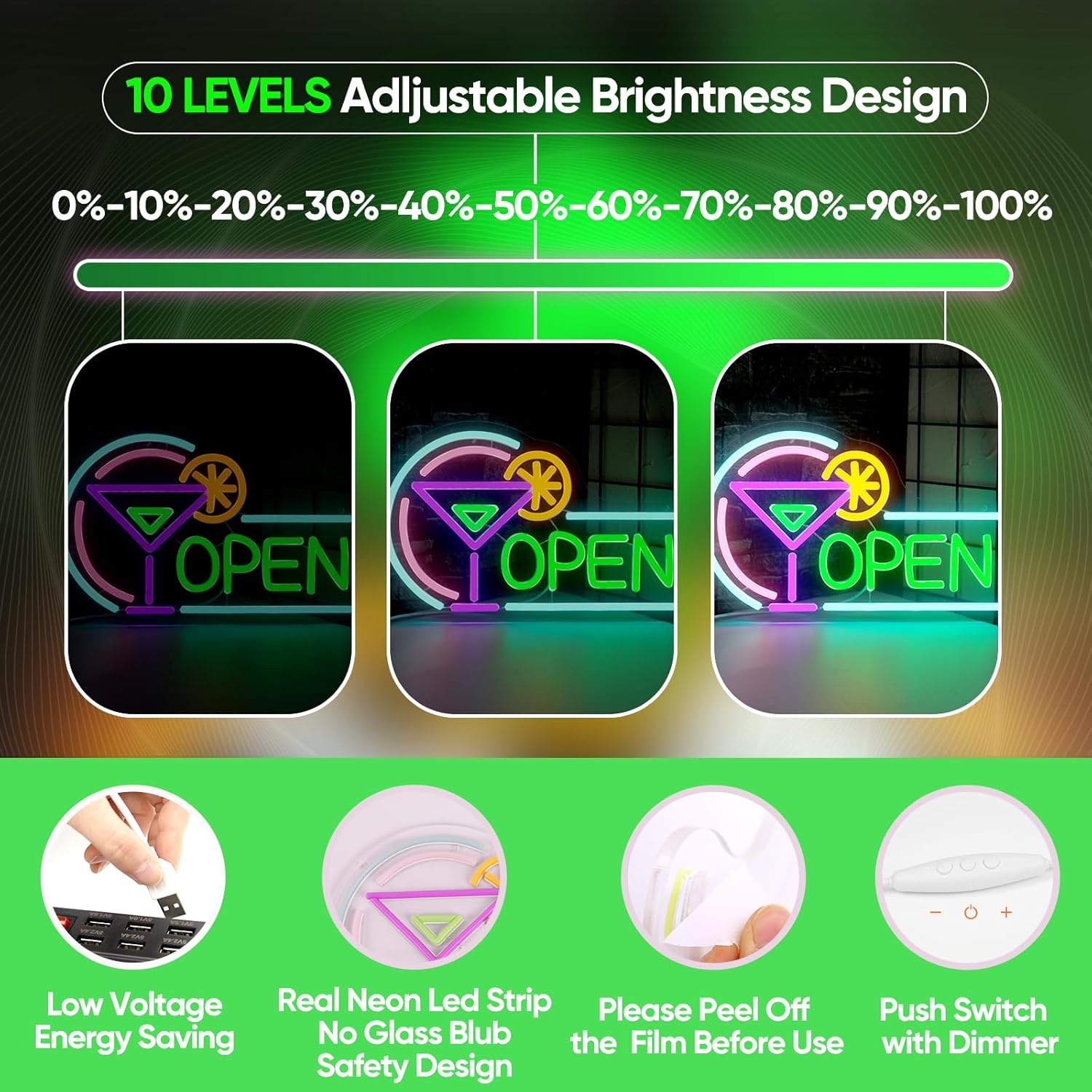 • 【USB Power Supply & Dimming Switch】The Cocktails Open neon sign uses a secure USB (which can be connected to a PC, charger, or power bank) to light up the open sign. The open neon lights have a dimmable switch ON/OFF power cord, allowing you to freely adjust the brightness and create the atmosphere you like.